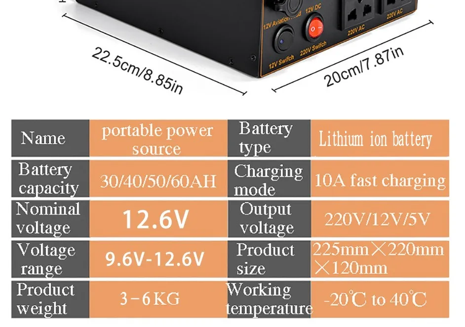 Источник питания  Мулти функциональный: 2 чистых гнезда АК волны синуса (пиковое 50ХЗ 220В 500В), 2 порта USB-A (5В, 2.4А) и 1 лихтер сигареты для того чтобы поручить умные телефоны, ноутбуки, камеры, вентиляторы, фонари и другие предметы первой необходимости в дороге. Поддерживает прямую зарядку. (Выделите детали интерфейса продукта при отображении сценариев приложения через изображения)