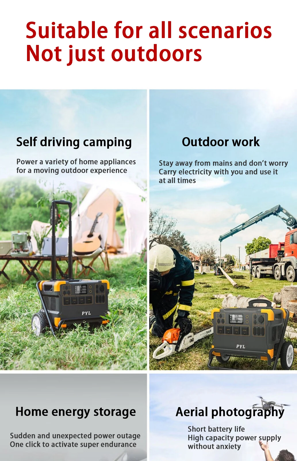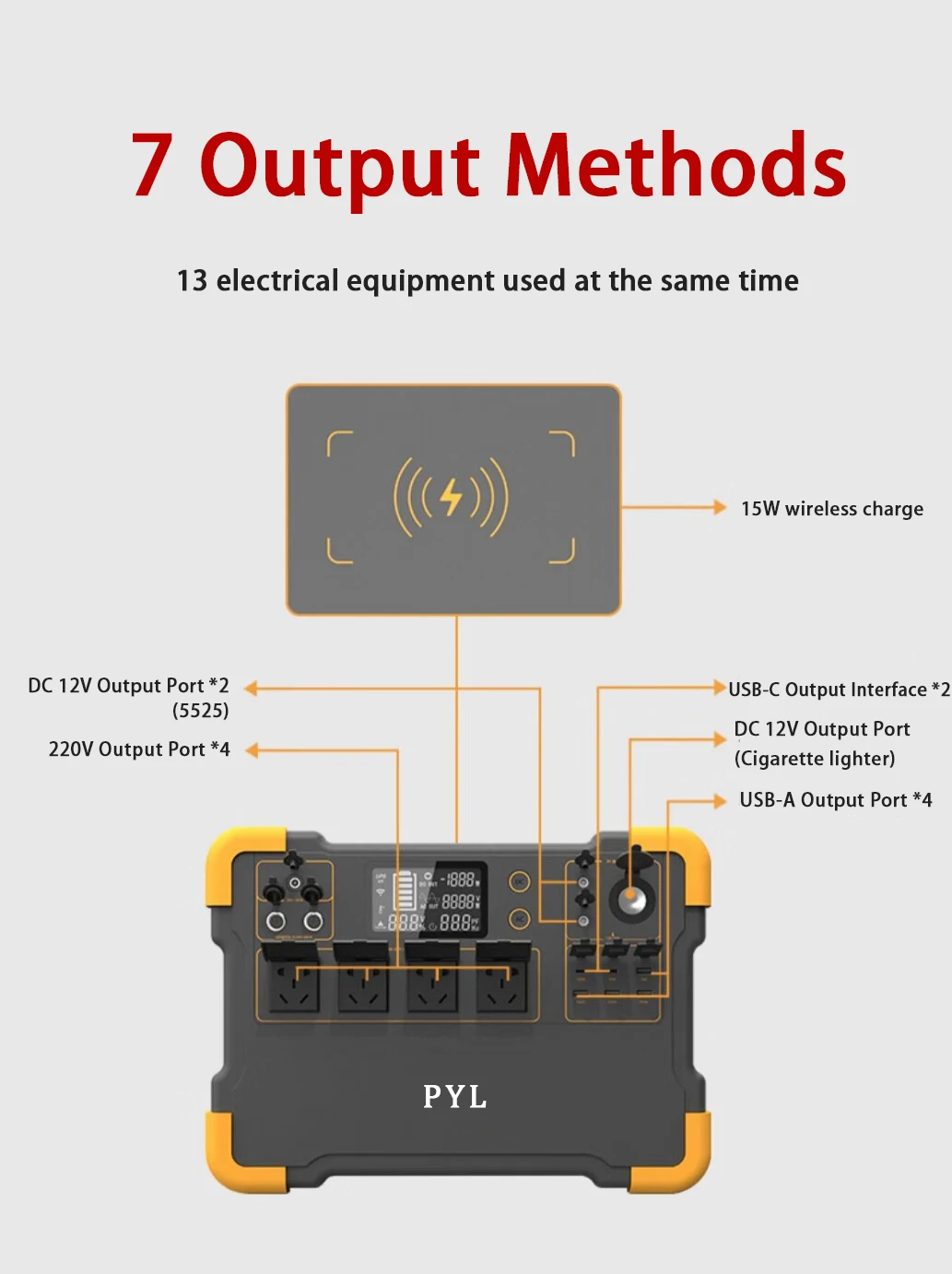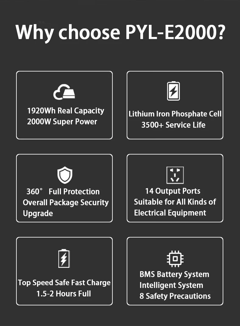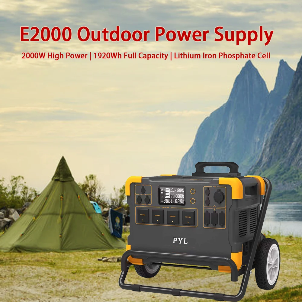 PYL E2000 Литий-железо-фосфатный элемент автомобильного класса, сертифицирован UL, полная зарядка и разрядка в 3500 раз, емкость более 80%, портативная электростанция 1920 Втч 2000 Вт (пиковая мощность 4000 Вт) 220V солнечный генератор внешний аккумулятор кемпинг автомобиль дома Открытый чрезвычайных.