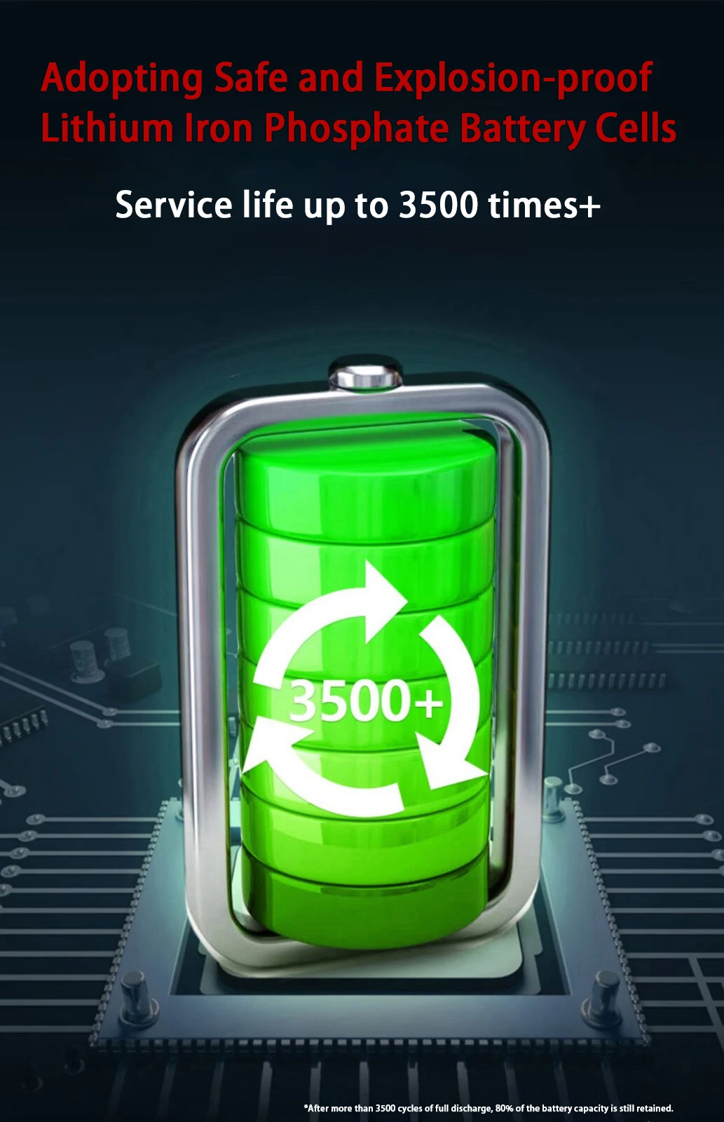 [Прочная и безопасная литиевая батарея] PYL ставит Безопасность пользователей на первое место, используя высококачественный автомобильный литий-железо-фосфатный аккумулятор, сертификацию UL, полная емкость зарядки и разрядки 3500 раз превышает 80%, встроенная в передовую систему управления батареями E2000, Может обеспечить перегрузку по току/перегрев/перегрузку/перенапряжение/низкое напряжение/короткое замыкание и другую множественную защиту. Позвольте вам быть уверенным использовать солнечные генераторы.