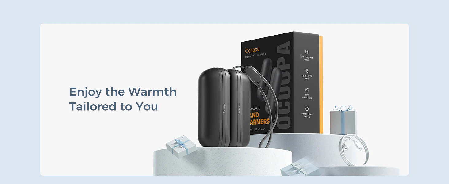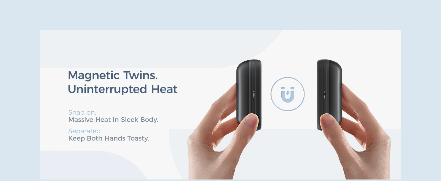 Под действием сверхмагнитной силы грелки для рук 2*2600 мАч могут объединяться в размер ладони, также легко отделяются, чтобы поместиться в два кармана куртки или перчаток. Вы можете использовать по одному в каждой руке или поделиться этим теплом со своей семьей.