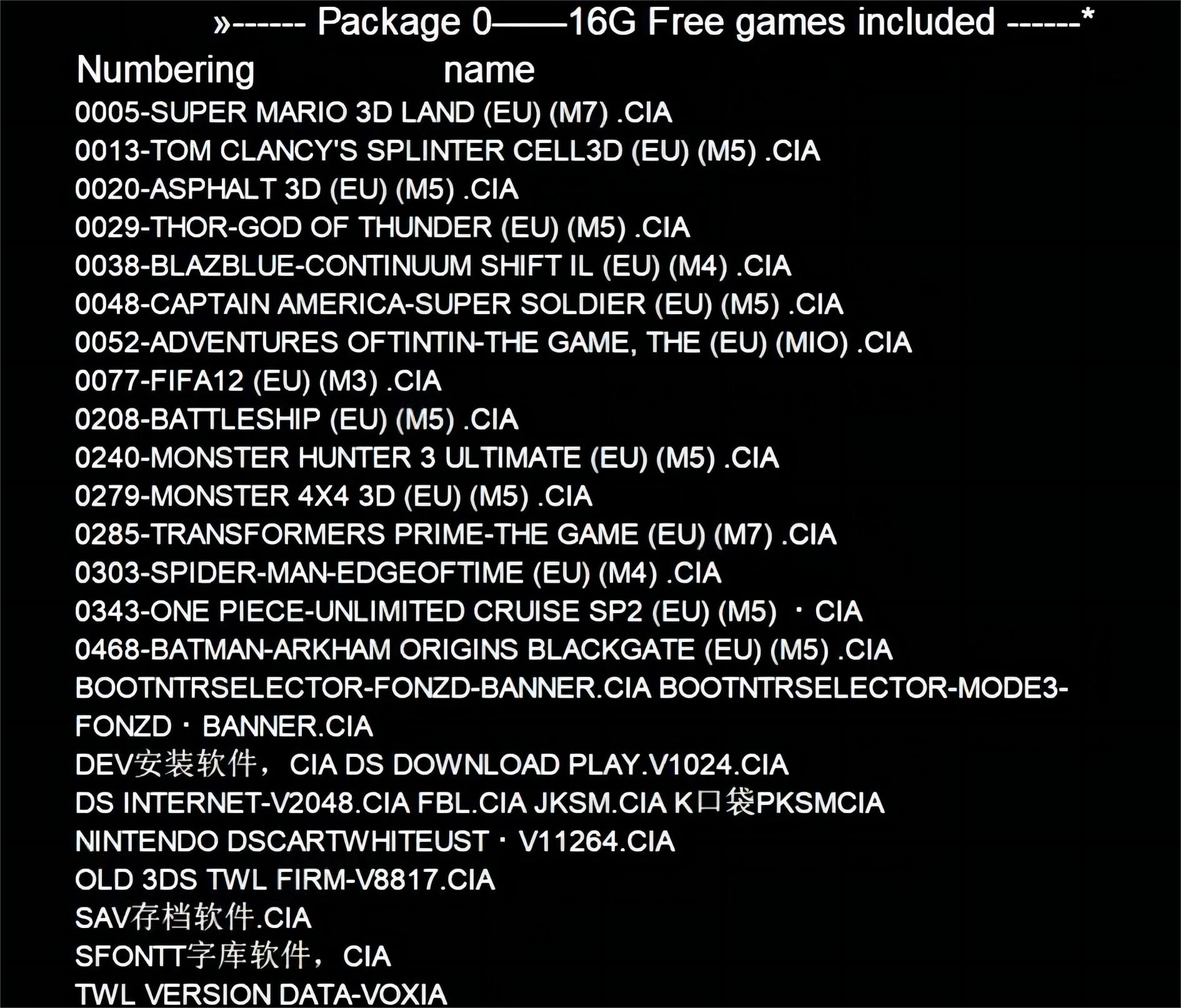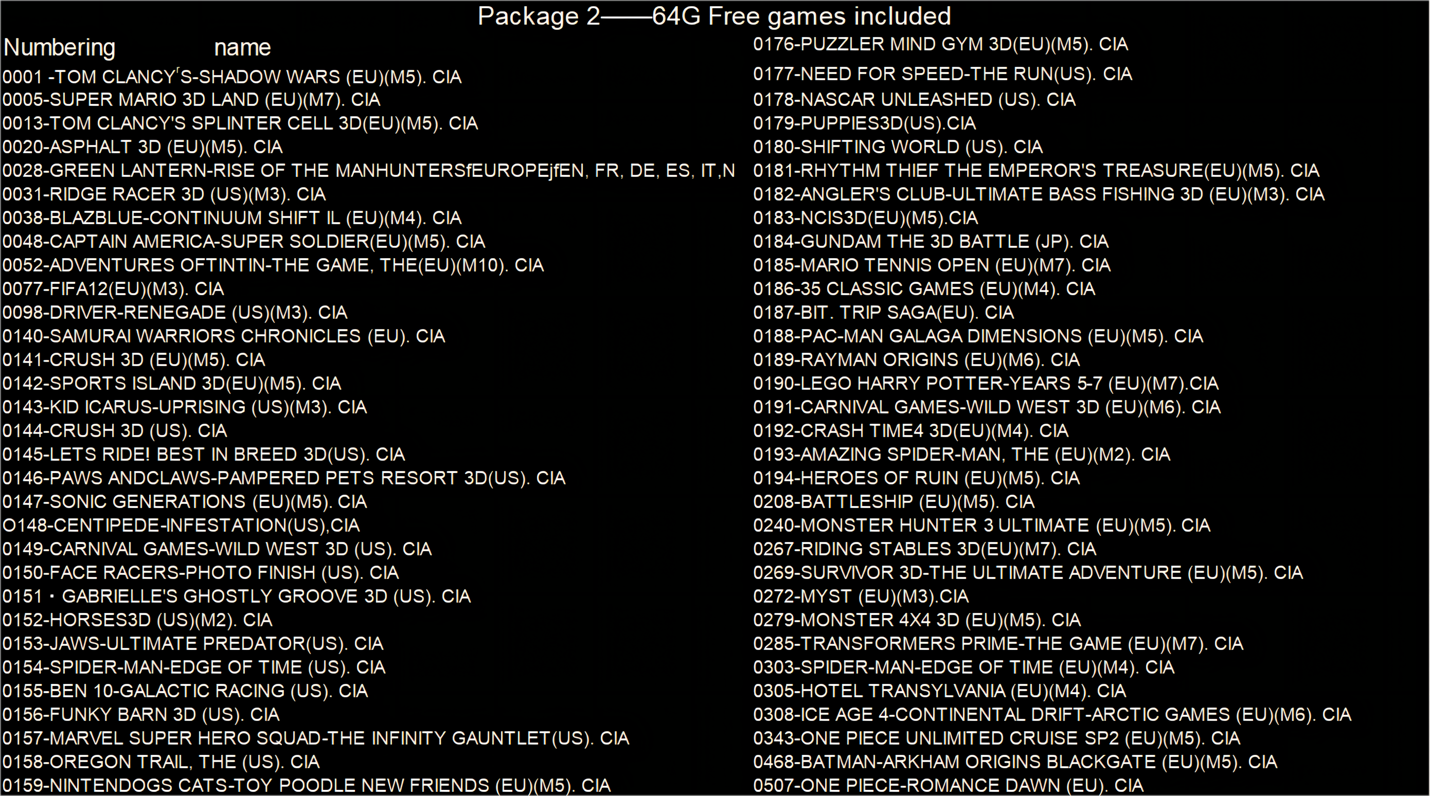 2. Из-за разных языков мы можем устанавливать только английскую версию игр. Прокрутите вниз список конкретных игр для просмотра.(Полезный совет: каждую карту памяти можно использовать только на одной игровой консоли! Если вам нужно заменить другую новую карту памяти, перепрошейте машину и повторно Импортируйте игры! Продавец не несет ответственности за системные проблемы, вызванные покупателем, который заменил карту самостоятельно!)