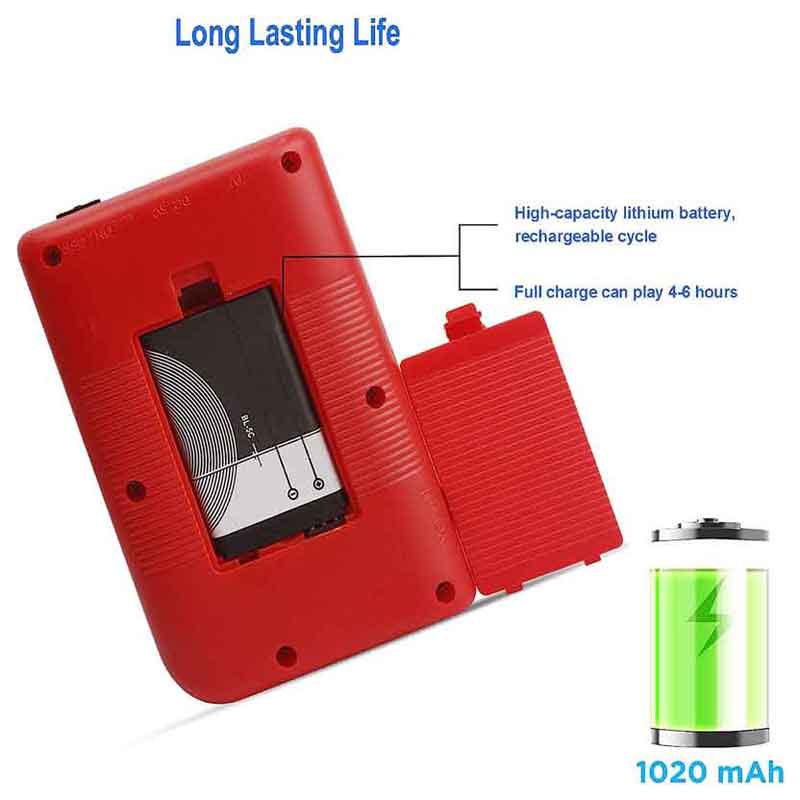 Встроенный литий-ионный аккумулятор большой емкости 1020 мАч, мини-игровая консоль поставляется с USB-кабелем, время зарядки составляет около 1-3 часов, вы можете играть в игры непрерывно в течение 5-6 часов. Когда вы путешествуете, путешествуете, кемпинге, вам не нужно беспокоиться о том, что у вас разрядятся силы. (Примечание: полностью зарядите аккумулятор перед первым использованием.)