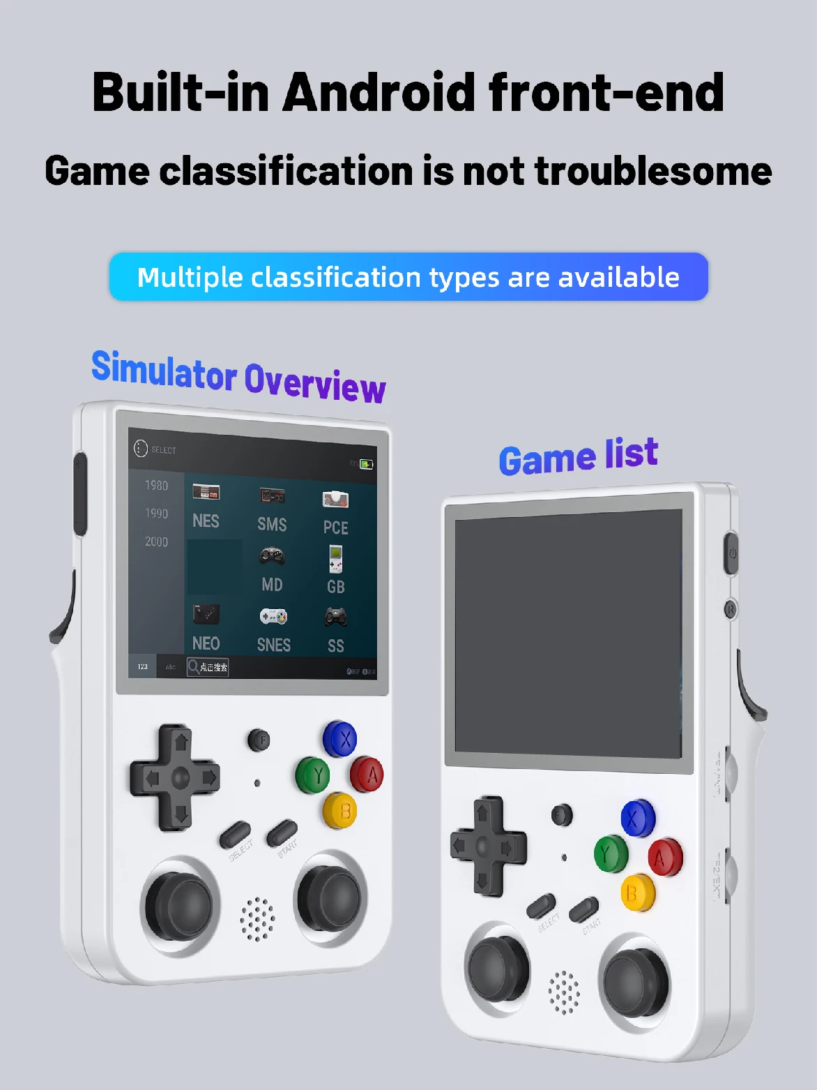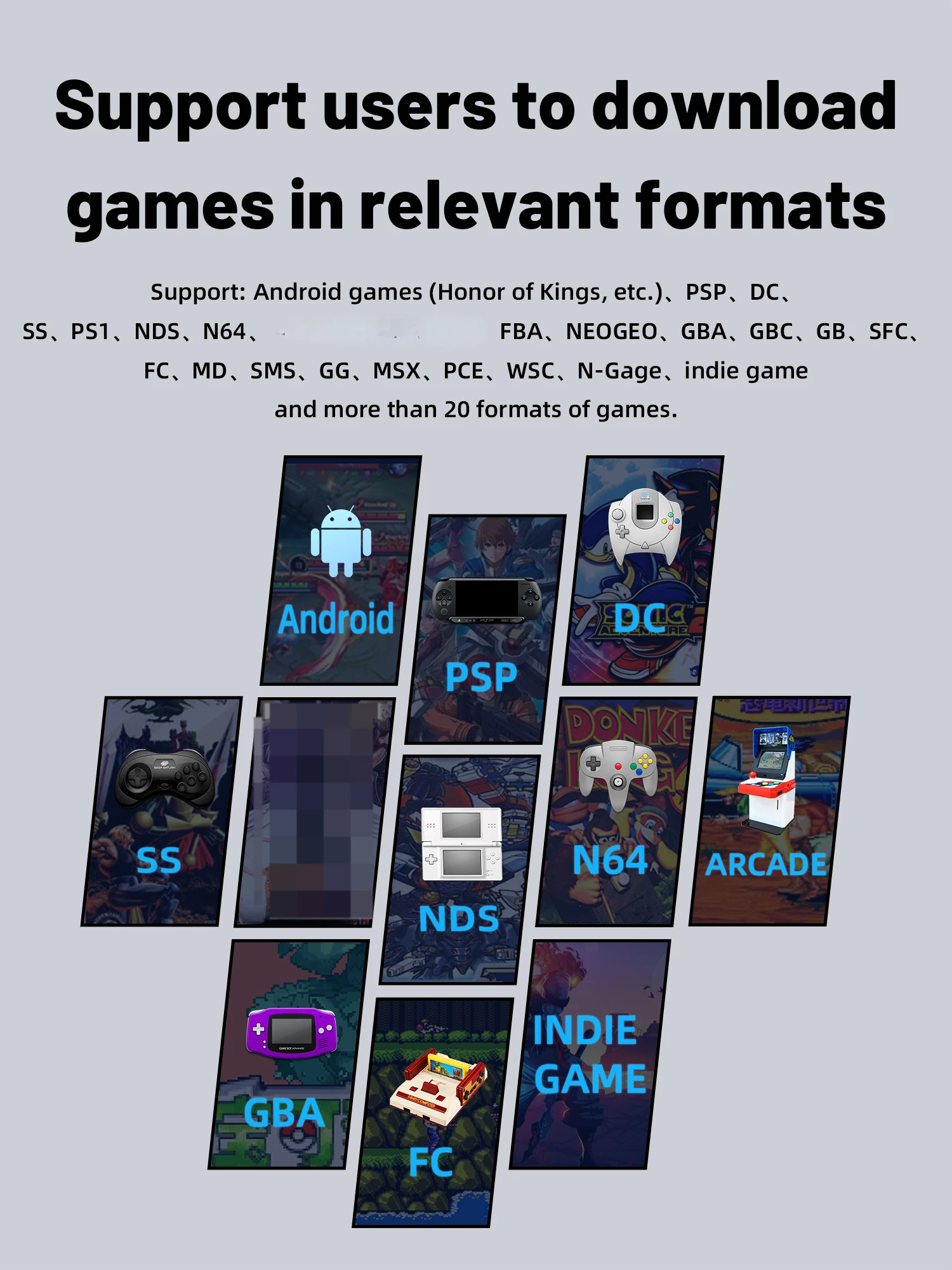 Поддержка: игры для Android (Honor of Kings и т. Д.),PSP,DC,SS,PS1,NDS,N64,FBA,NEOGEO,GBA,GBC,GB,SFC,FC,MD,SMS,GG,MSX,PCE,WSC,N-Gage, Инди-игры и более 20 форматов игр