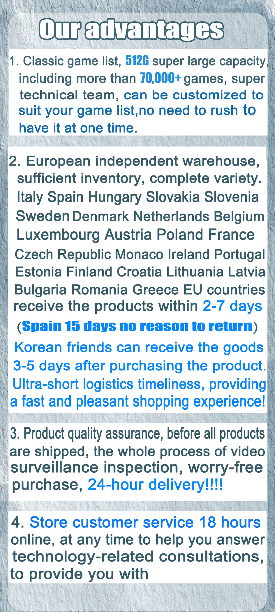 Англия, Франция, Италия, Испания, Австрия, Португалия, Нидерланды, Польша, Дания, Словакия, Словения, шведский, венгерский, Чешская Республика, Хорватия, бельгия и другие страны ЕС приобретают товары в течение 3-15 дней. Ультра-короткая своевременность логистики, обеспечивающая быстрые и приятные покупки! (Турецкие покупатели обращаются в службу поддержки клиентов, чтобы предоставить идентификатор после покупки, и магазин будет нести все обязанности.)
