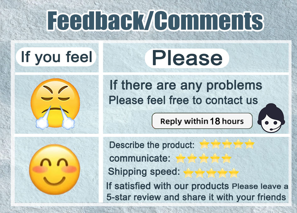 1. Если вы удовлетворены нашими продуктами и услугами, пожалуйста, оставьте положительный отзывы и 5 звезд. Вы можете поделиться своими фотографиями в положительном отзывы, и мы вышлем вам купон или подарок.