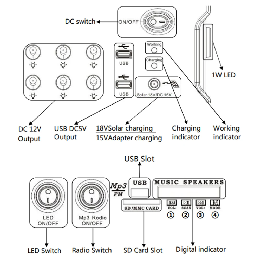 2.Эта система представляет собой чистую систему Вывода постоянного тока, радио, функцию светодиодного освещения, два выходных порта USB 5 В, шесть выходных портов постоянного тока 12 В.