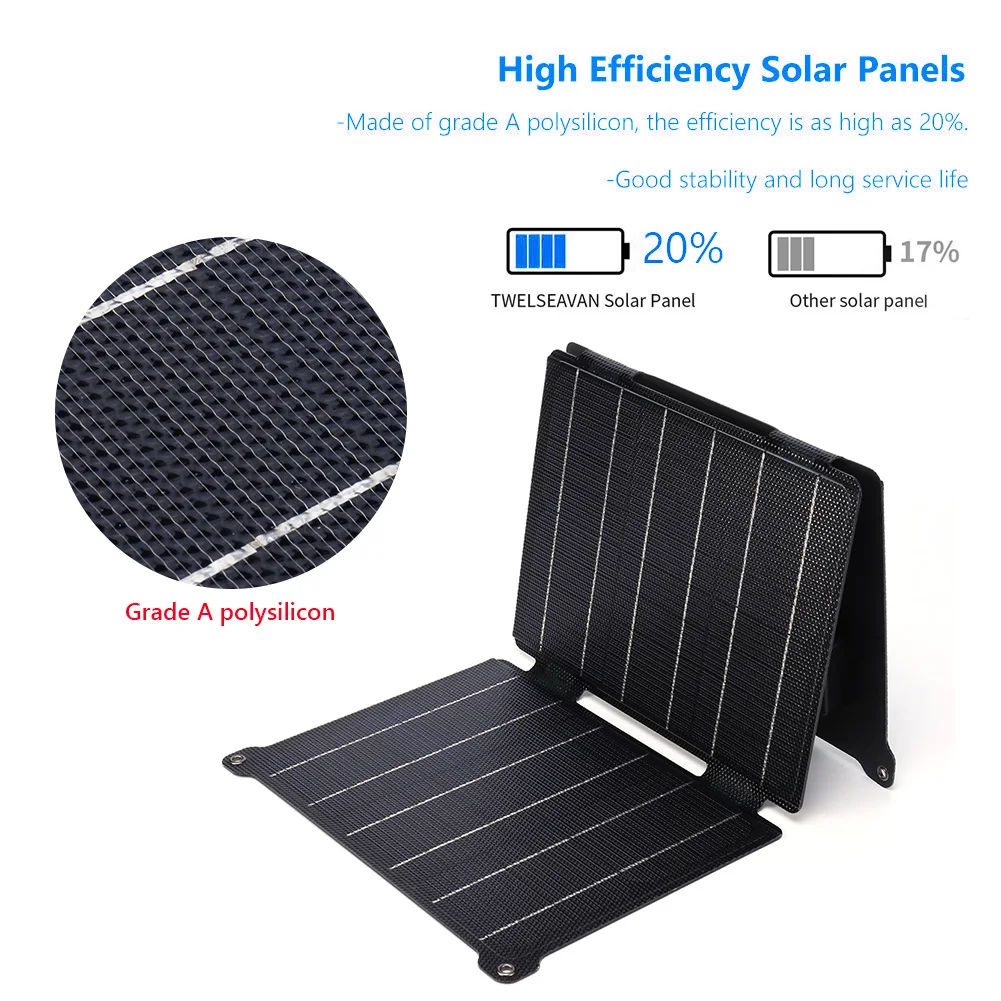 2. Панель солнечных батарей высокой эффективности:Это солнечное зарядное устройство мощностью 30 Вт изготовлено из монокристаллической кремниевой солнечной панели класса А с эффективностью до 20,5%. Это означает, что вы получите больше энергии и более быструю зарядку при тех же условиях солнечного света.