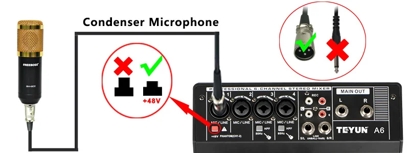 Когда вы используете динамический микрофон, пожалуйста, не включайте Фантом + 48 В, иначе динамический микрофон может сгореть.