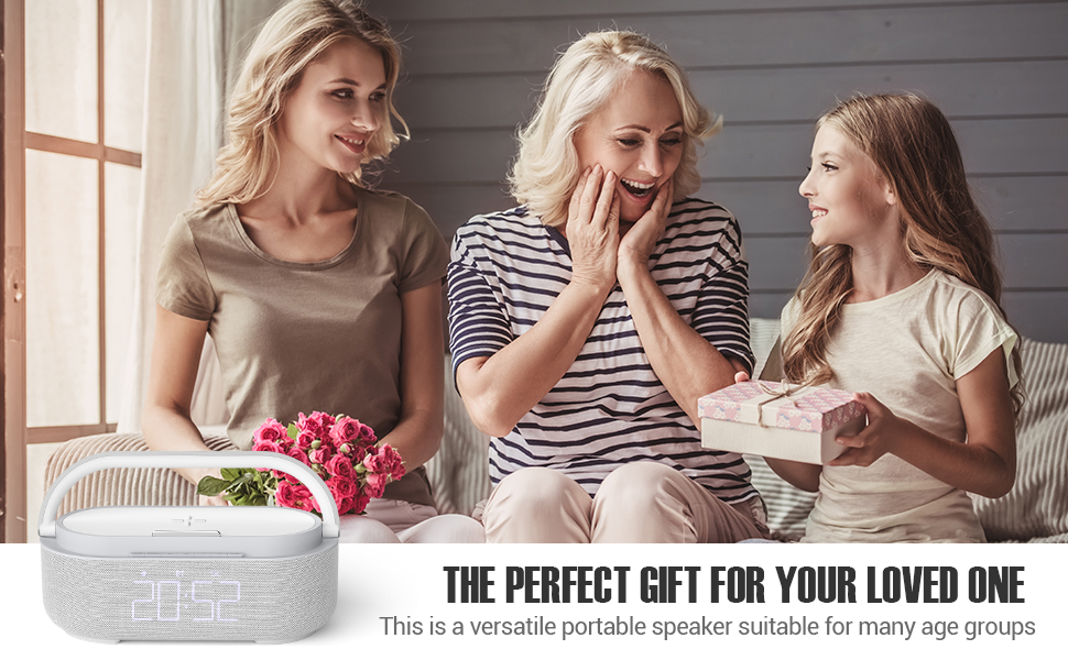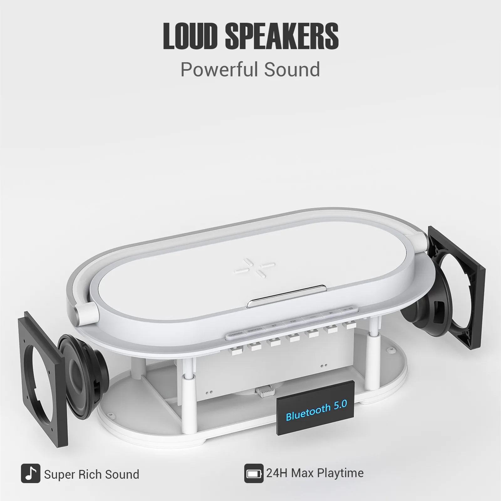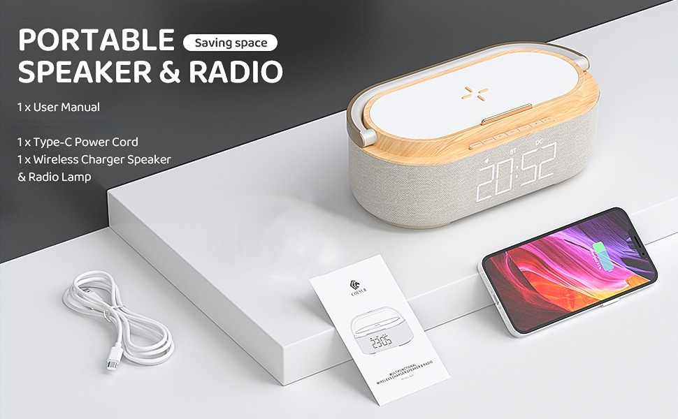 【Инновационный упрощенный дизайн и портативный】 Уникальный дизайн 6 в 1-Bluetooth Audio и FM-радио, будильник, ночник уровня 3, Беспроводная зарядка 15 Вт и держатель для телефона.