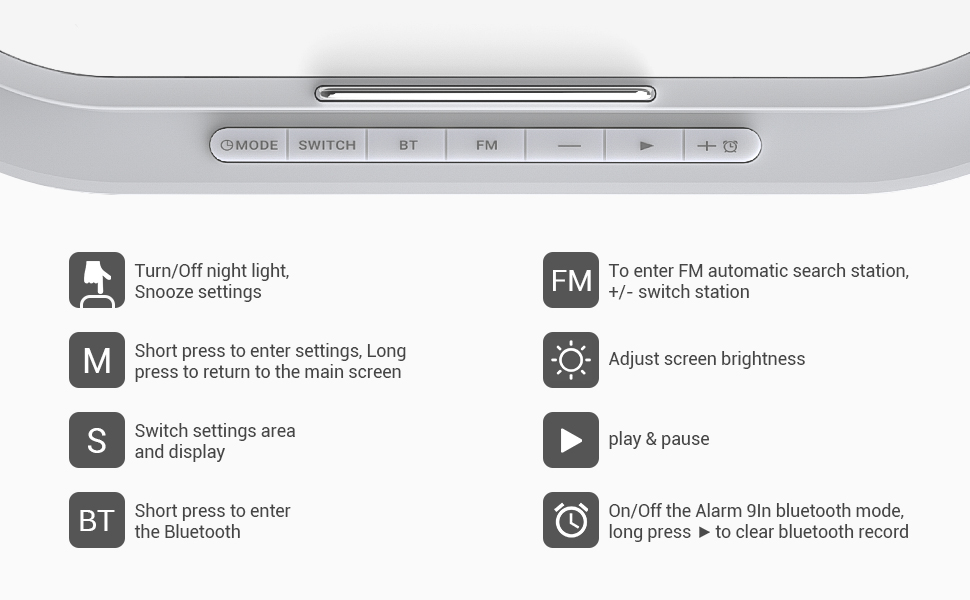 Светодиодный цифровой дисплей предлагает 3 уровня яркости (низкий, средний, высокий) для удобного чтения времени. FM-радио может искать каналы одним касанием, а затем выбирать свой любимый канал.