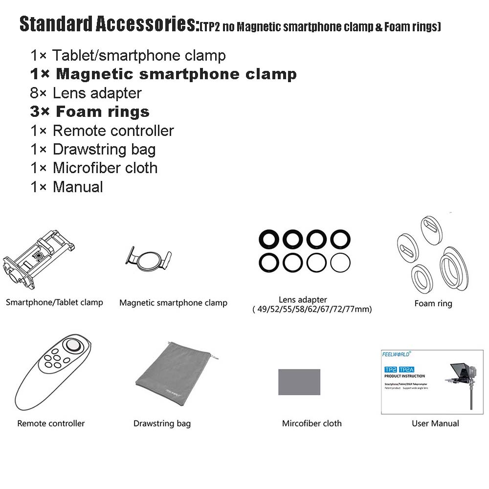 TP2A компактный по размеру и весит всего 300 граммов, что легко положить в прилагаемый мешок на шнурке для защиты телепромпитора, а также позволяет быстро переходить. Кроме того, прилагаемая ткань из микрофибры может поддерживать чистоту телепромпера в любое время.