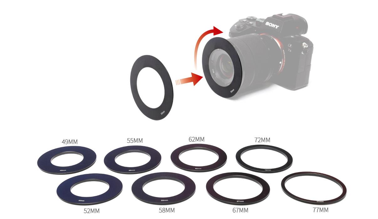 В TP2A со стандартным 49/52/55/58/62/67/72/77 мм восемь кольца адаптеров объектива. Вы можете выбрать тот, который подходит для объектива камеры.