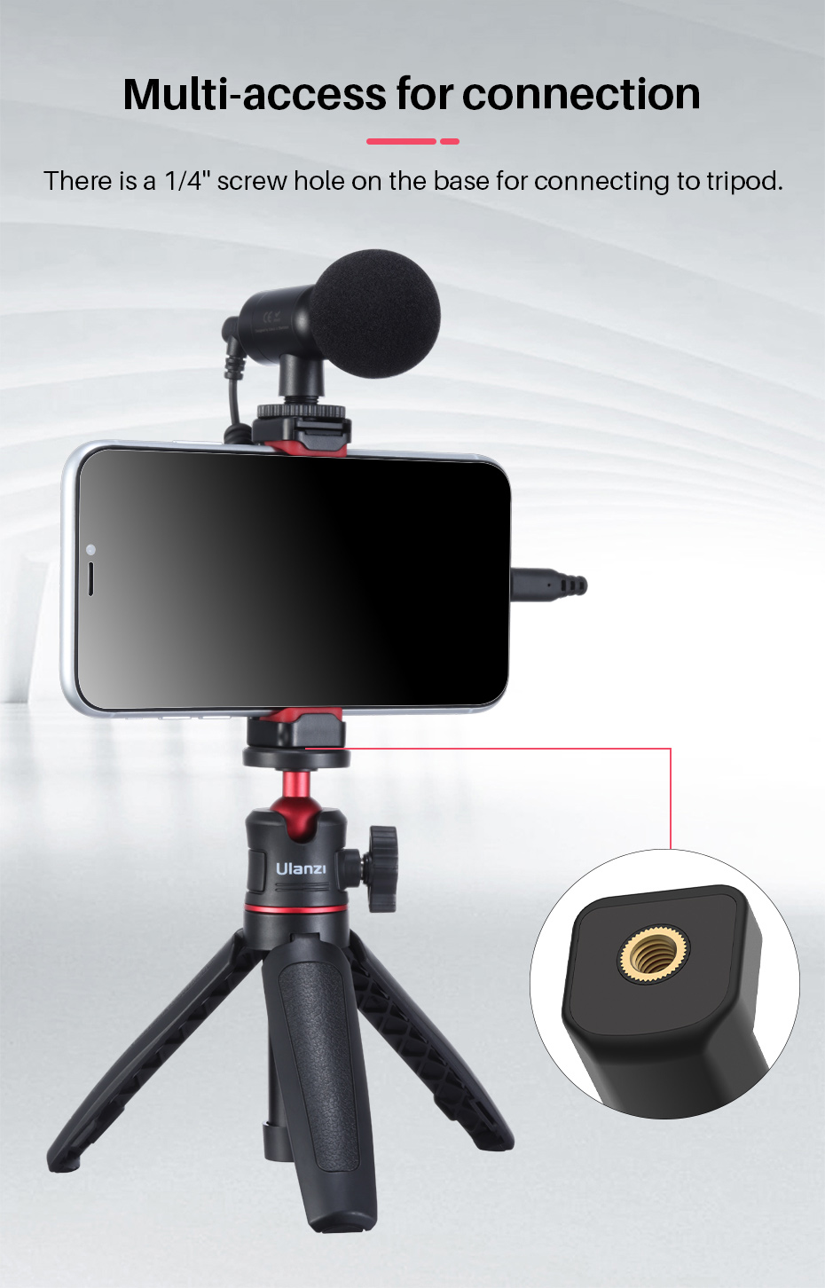3. Универсальное отверстие для винта 1/4 дюйма в нижней части зажима для телефона, может быть прикреплено к ручке штатива и т. Д. С сильным расширением.
