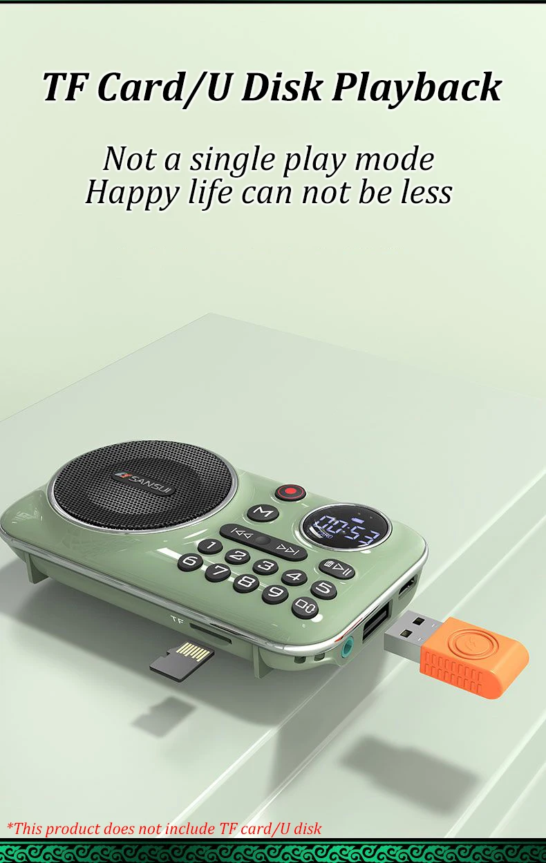 Радио поддерживает воспроизведение карты памяти TF, воспроизведение диска U, воспроизведение наушников, подходит для использования в различных сценариях и позволяет наслаждаться высококачественной музыкой.