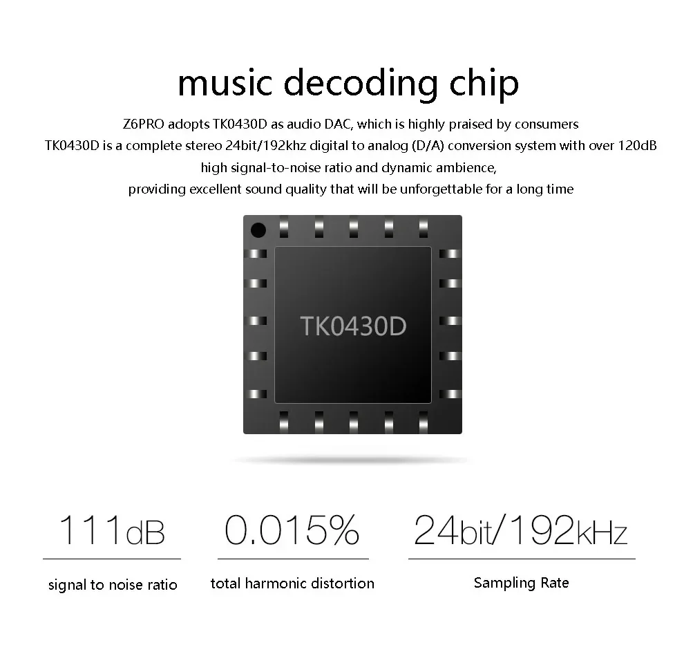 Z6PRO использует TK0430D в качестве звукового ЦАП, который хорошо принят потребителями. TK0430D-это полная стереосистема 24 бит/192 кГц цифро-аналоговая (D/A) система преобразования с отношением сигнал/шум более 120 дБ и динамической атмосферой. Он может обеспечить отличное качество звука и сделать людей незабываемыми на долгое время.