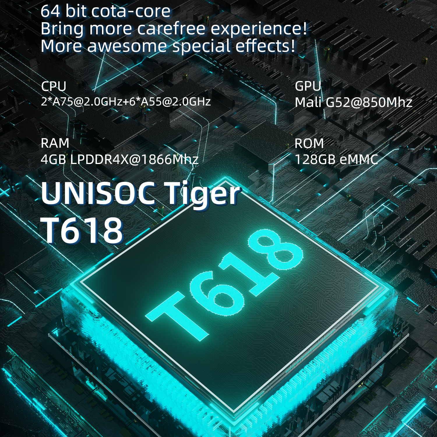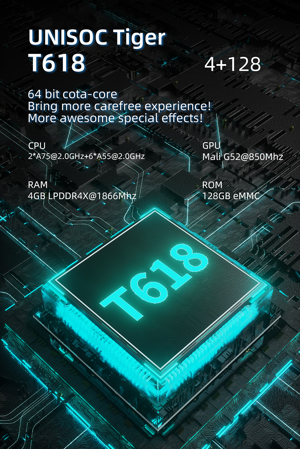 Процессор:Unisoc Tiger T618 64-битный cota-core 2 * A75@2.0GHz + 6 * A55@2.0GHz