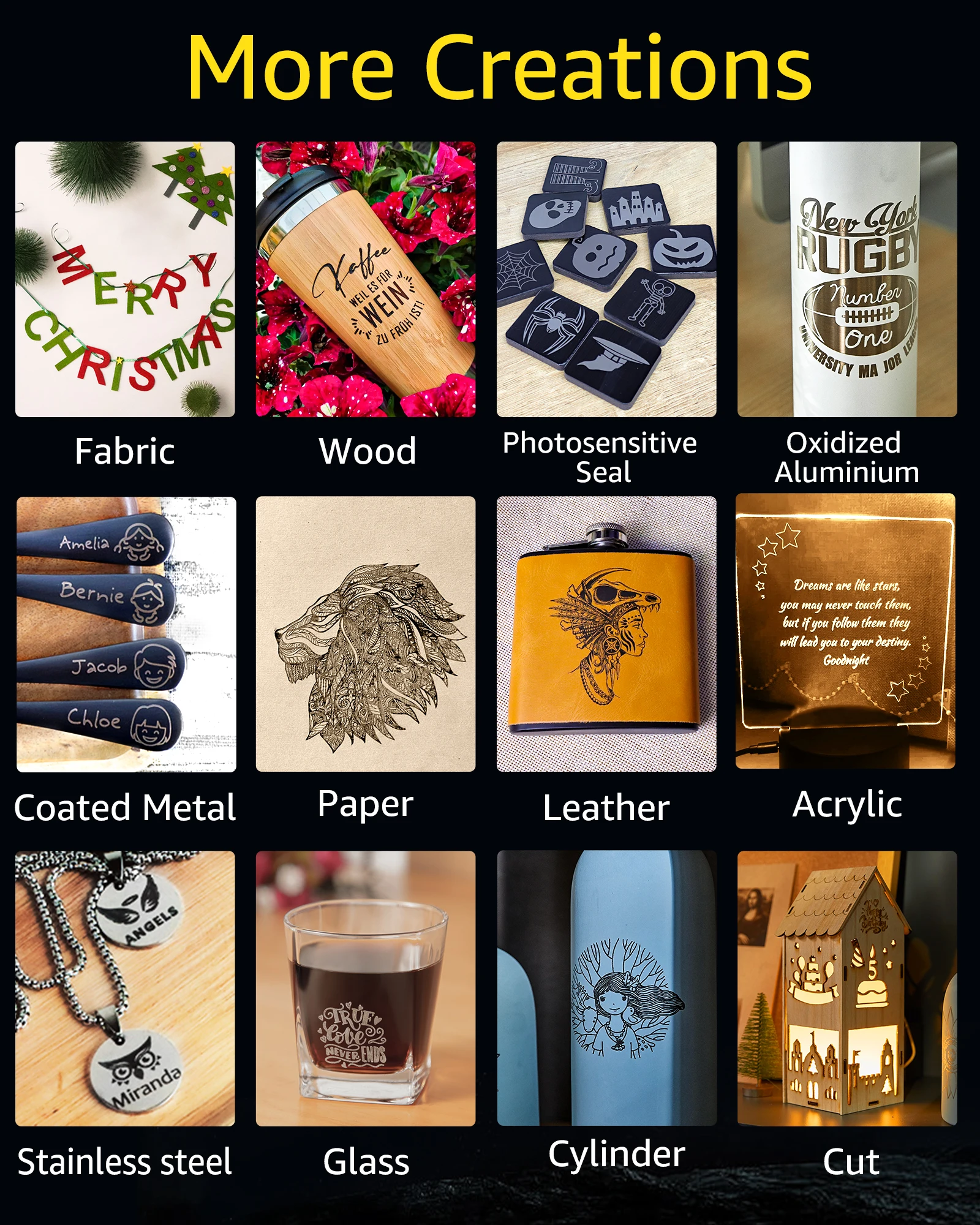 L1 Pro хорош для резьбы по неметаллическим мягким материалам, таким как бумага, кожа, бамбук, пластик, акрил, фрукты, войлочная ткань, светочувствительные уплотнения и т. Д.