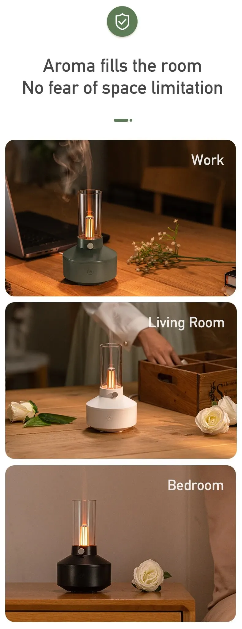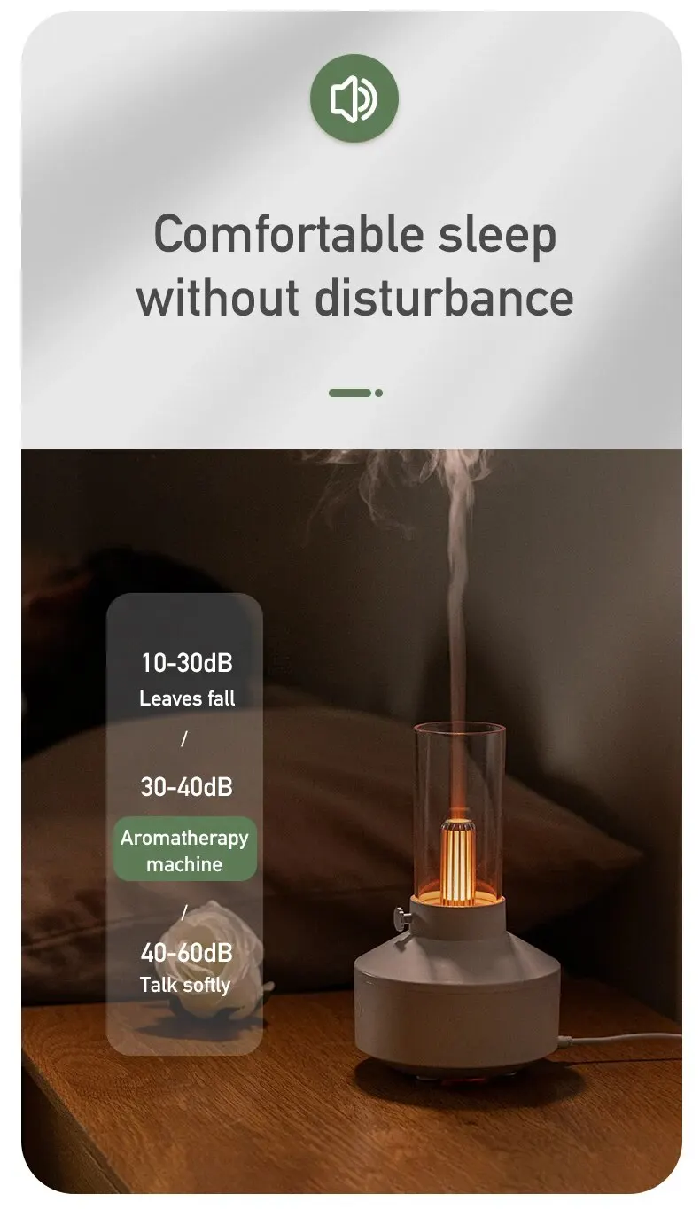 Простой стиль ретро-дизайна, эффект теплого света при свечах; Успокаивающий и заживляющий Тип деликатного ароматерапевтического распыления; Встроенный интеллектуальный чип для защиты от нехватки воды и отключения электроэнергии. Ультразвуковое распыление может добавить эфирные масла. Работа с низким децибелом, комфортный сон без помех. Подходит для офисов, спален и гостиных.
