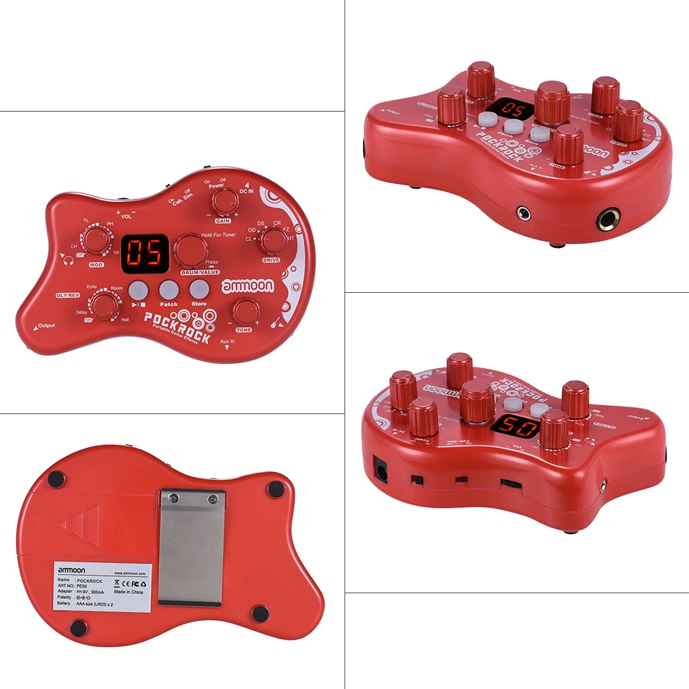 AmmoonPockRock-портативная гитарная педаль с несколькими эффектами. 5 модулей эффектов с 15 типами эффектов, 40 барабанными ритмами, 16 предустановленными патчами и 16 пользовательскими патчами. Это не только звуковая библиотека, но и позволяет создавать свою собственную звуковую библиотеку. Благодаря наушникам и входу AUX вы можете наслаждаться игрой ночью и не беспокоиться о том, чтобы беспокоить других. Режим с питанием от батареи позволяет брать его с собой куда угодно. Все, что вам нужно, в PockRock!