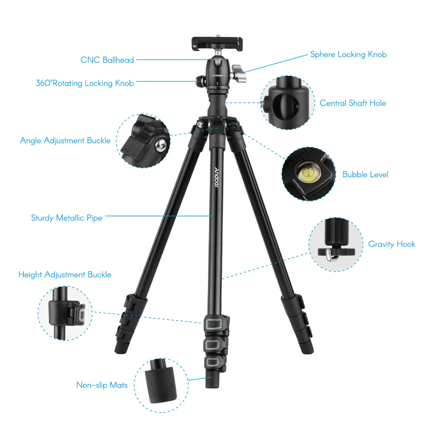 Легкий и компактный штатив весит всего 0,99 кг (2,18 фунта), с регулируемой высотой от 43 см (17 дюймов) до 154 см (60,6дюйма); Независимо от того, на любой высоте, центральная колонна может быть стабильно помещена Горизонтально для идеальной макросъемки.