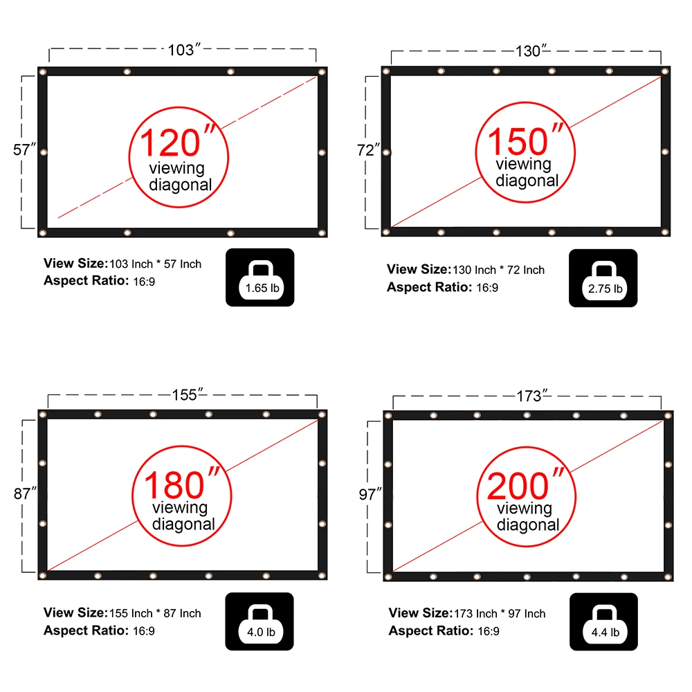 • Размер диагонали: 60/72/84/100/120/150/180/200 дюймов на выбор, Соотношение сторон: 16:9; Пожалуйста, примите во внимание, потому что это гибкий материал, размеры проекционного материала могут отличаться на +/-0,5 ”по длине/ширине;