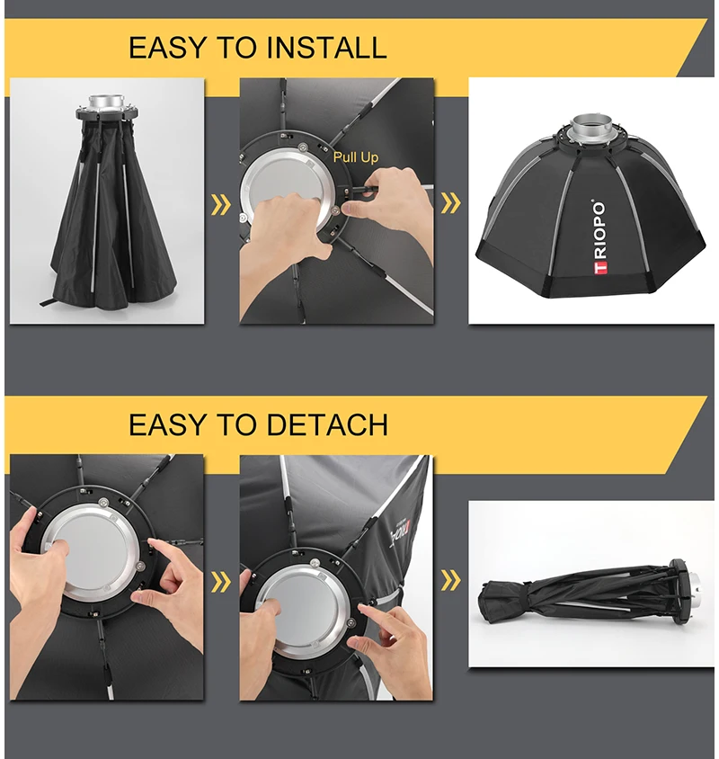 1. Внутри с отражающим серебром и передним полупрозрачным диффузором, отлично подходит для вспышки Speedlite, монолитного, стробоскопа или ведомого.