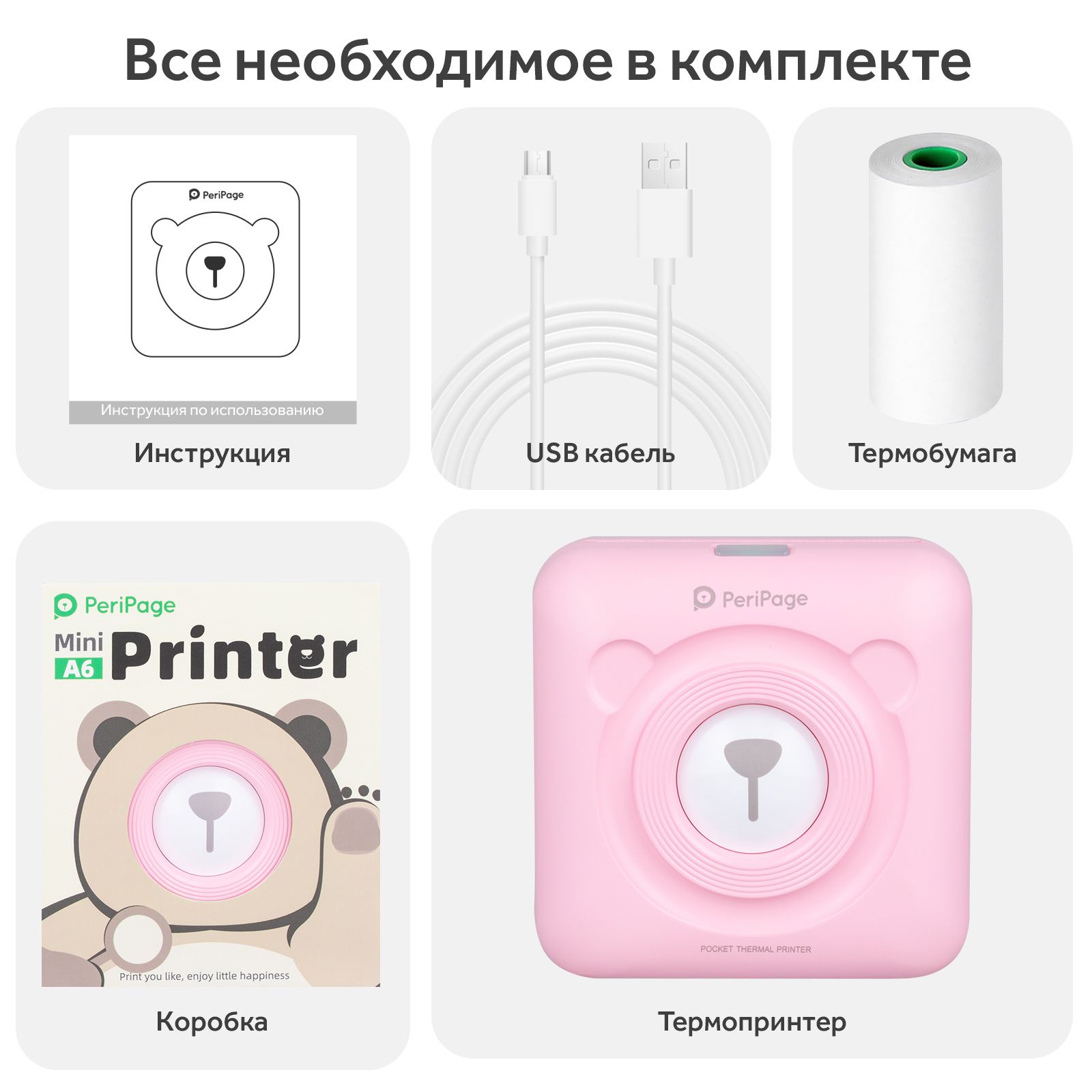 Термопринтер, Белая термобумага 1 рулон, USB кабель, Инструкция