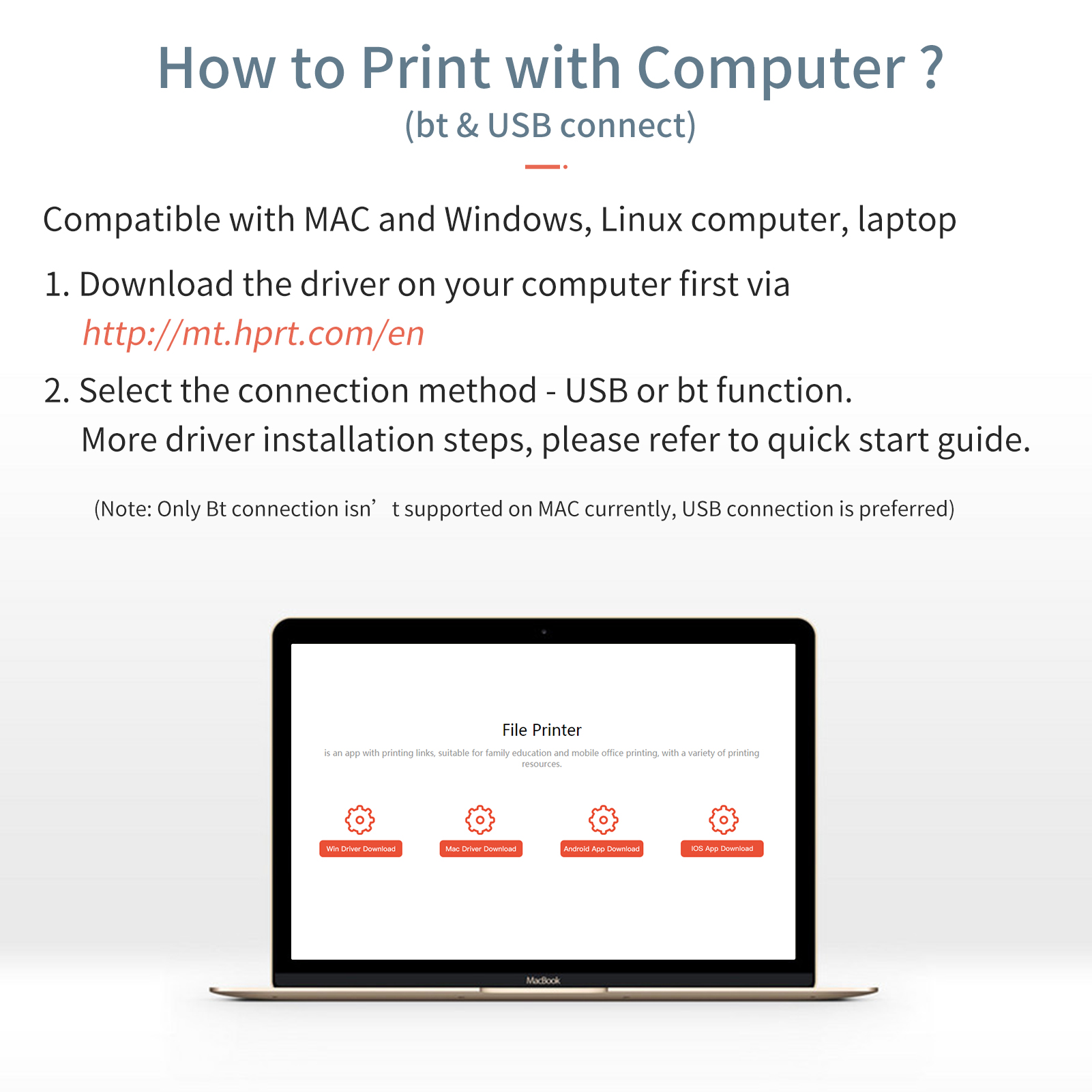 Беспроводная и USB-печать-поддержка подключения к мобильному устройству с помощью функции BT, приложение «Hiprint» предоставляет множество шаблонов, шаблонов и материалов со значками, которые вы можете редактировать свой файл/изображение/плакат/список, и т. д. И вы можете загрузить драйвер и подключиться к ПК или компьютеру с помощью функции BT или USB-подключения для печати, проста в эксплуатации. (Примечание: в настоящее время на MAC не поддерживается только соединение Bt, предпочтительнее USB-соединение)