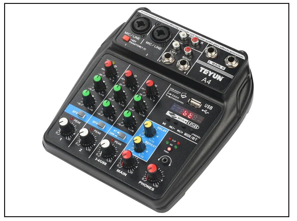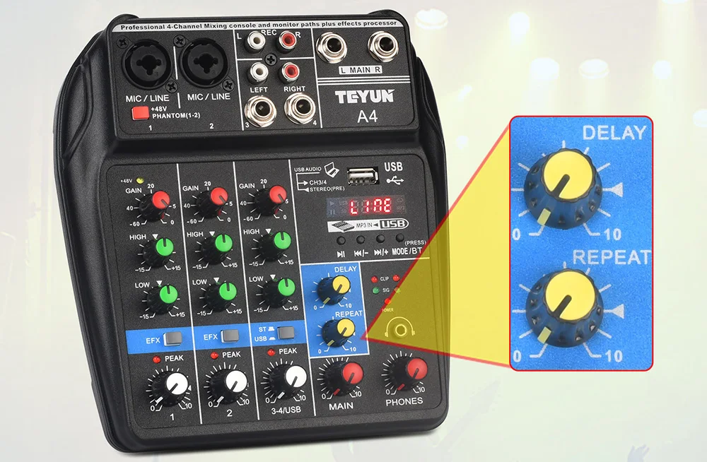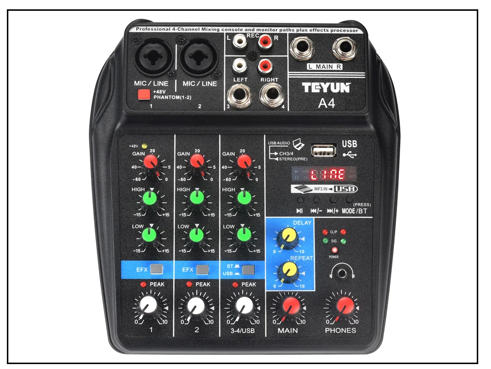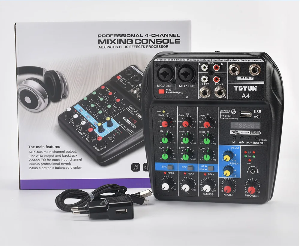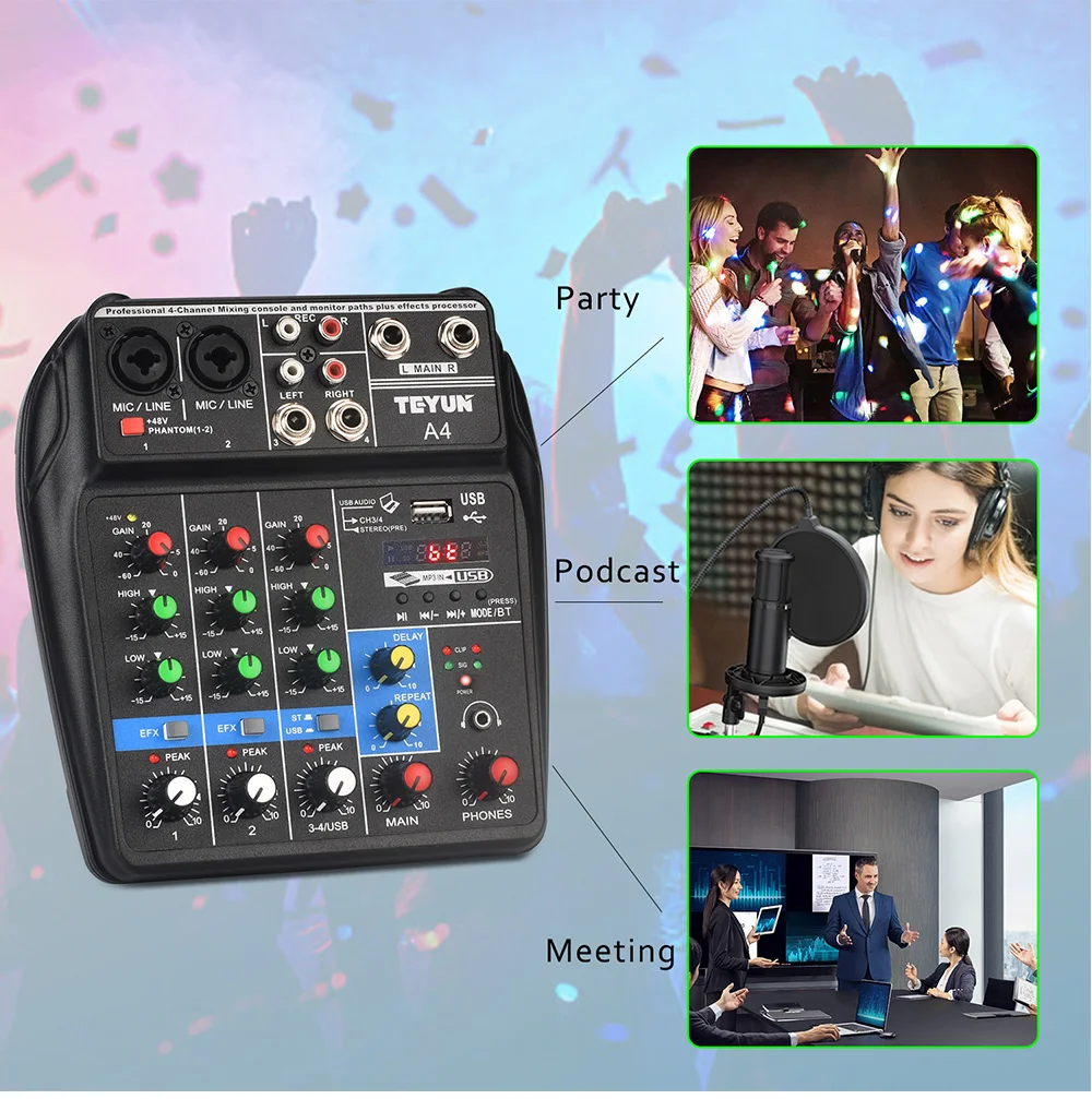 Портативный звуковой Миксер с эффектом задержки повтора, 4 канала, 48 В, с Bluetooth, микшерная консоль, USB Запись PC Play, вещания, таблица A4