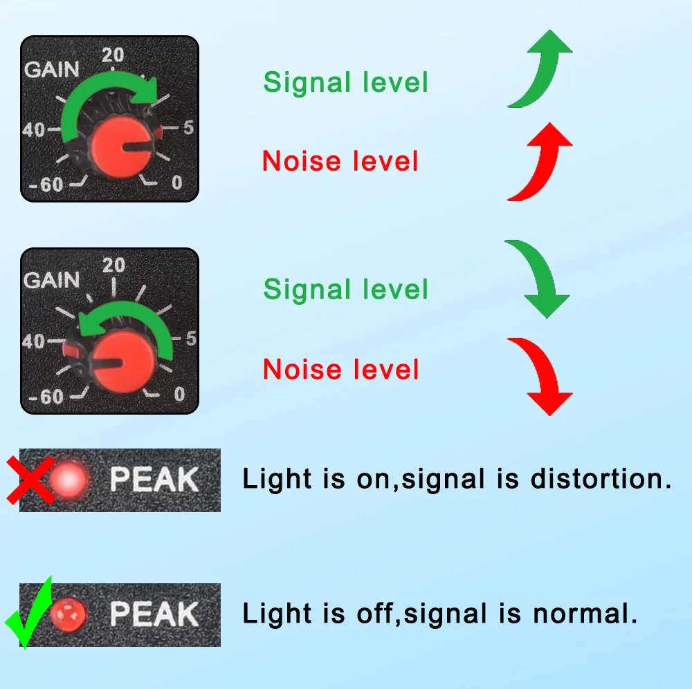 (3) Поверните ручку усиления, уровень сигнала увеличится, а уровень шума увеличится одновременно.