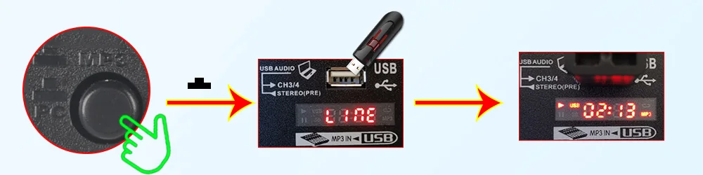 A) Нажмите кнопку MP3/PC на задней панели аудиомикшера.