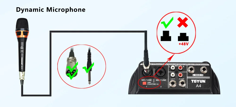 При подключении динамического микрофона к аудиомикшеру через кабель XLR не подключайте фантомное питание + 48 В.