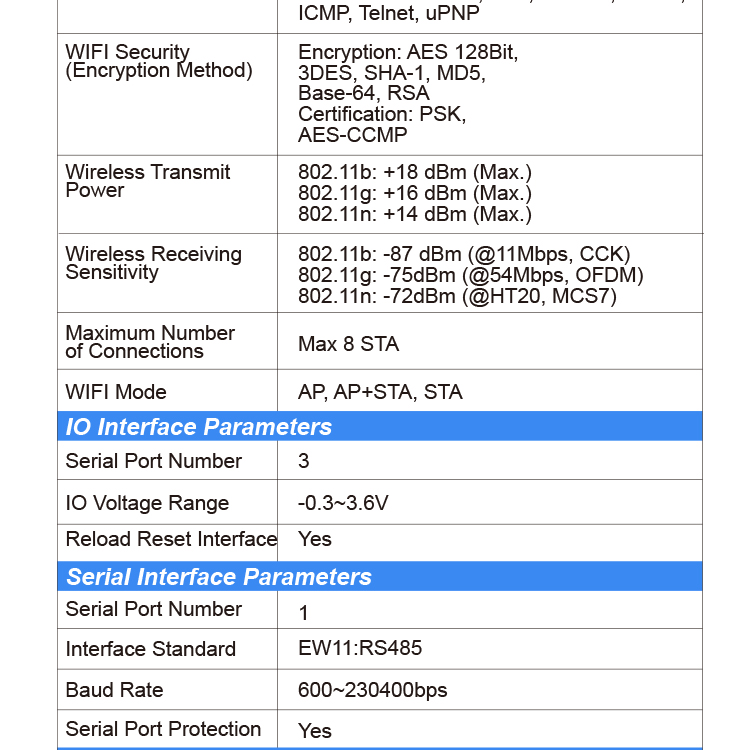 • Поддержка RS485 для преобразования Ethernet/Wi-Fi, последовательная скорость до 460800 bps