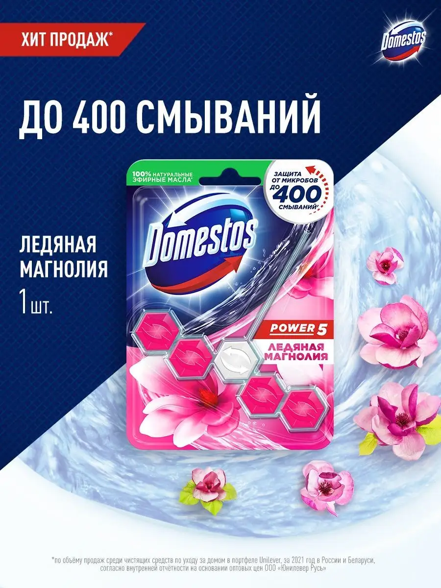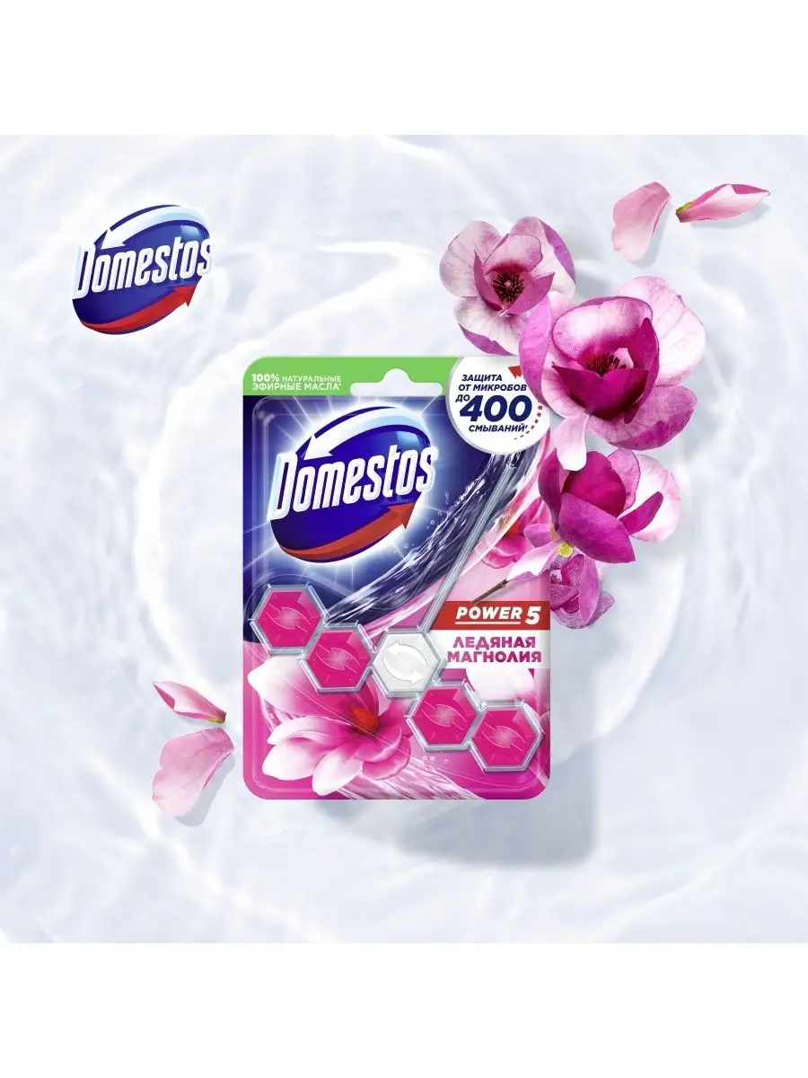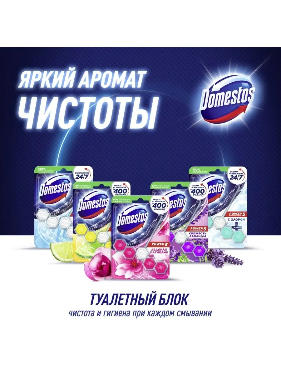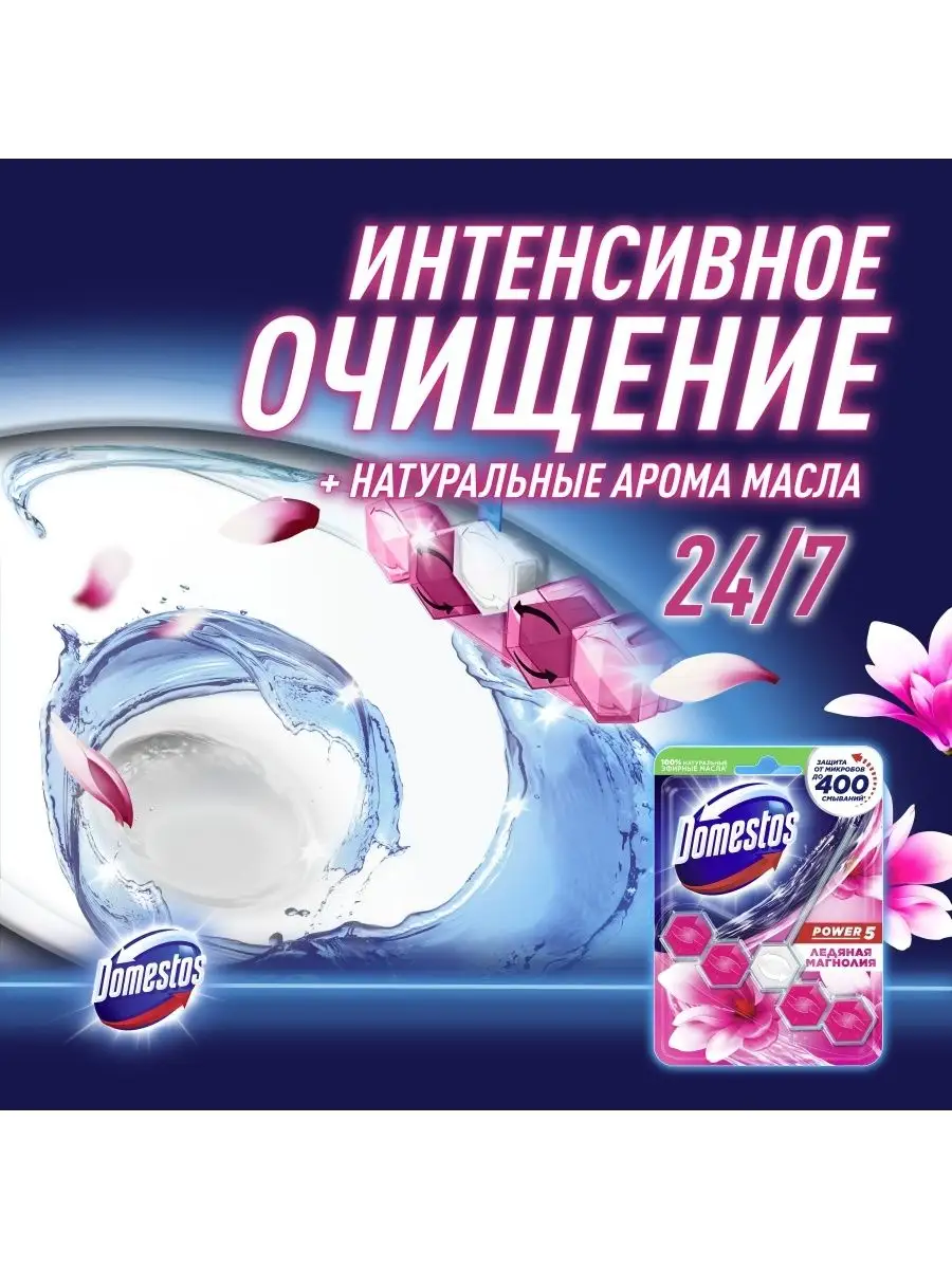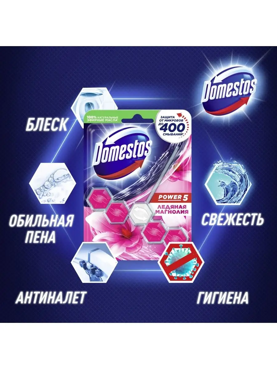 Описание: Попробуйте сменный блок для очищения туалета Domestos Power 5 Ледяная магнолия против известкового налета и неприятного запаха, помогающий обеспечить защиту от загрязнений и микробов. При каждом смывании появляется яркий аромат магнолии на срок до 4 часов и обильная пена, которая борется с налетом, поддерживая гигиену и блеск поверхности унитаза. Блок для унитаза Domestos содержит активное вещество, которое под действием напора воды защищает от бактерий и помогает бороться с появлением известкового налета. Средство наполняет комнату ярким ароматом, который помогает предотвращать неприятные запахи и остается в течение длительного времени после смывания - до 4 часов.Как использовать туалетный блок? Вскройте пластиковую упаковку, достаньте блок для туалета и поместите под ободок унитаза в место наиболее сильного потока воды с помощью держателя. После использования гигиенического блока для унитаза Доместос Power 5 Ледяная магнолия выбросите его в мусорное ведро.