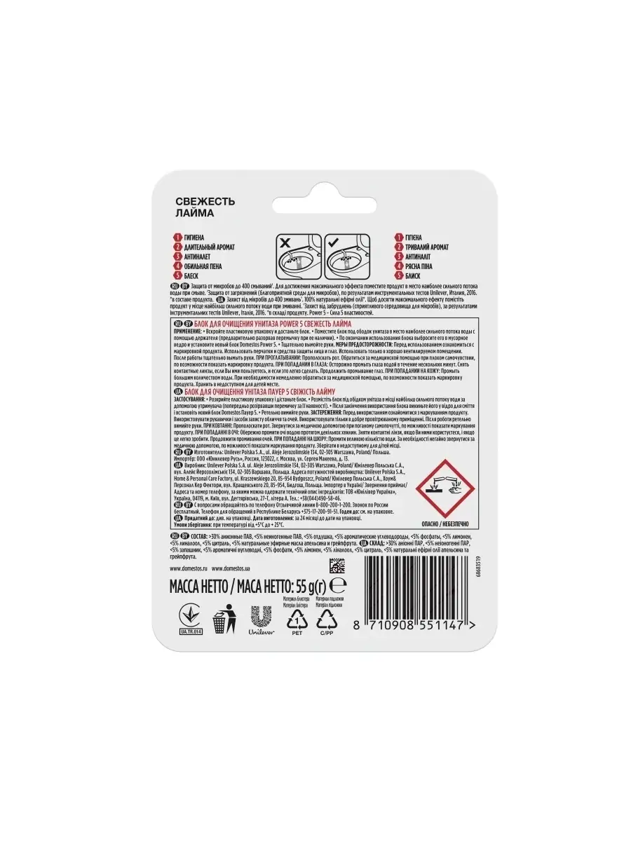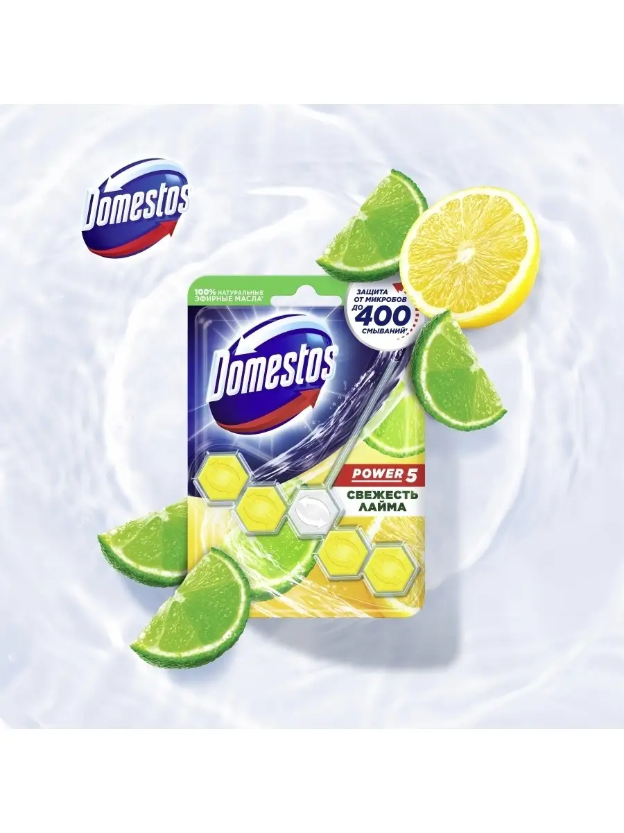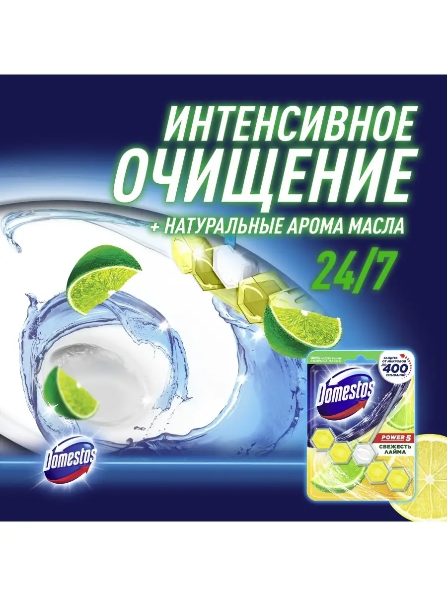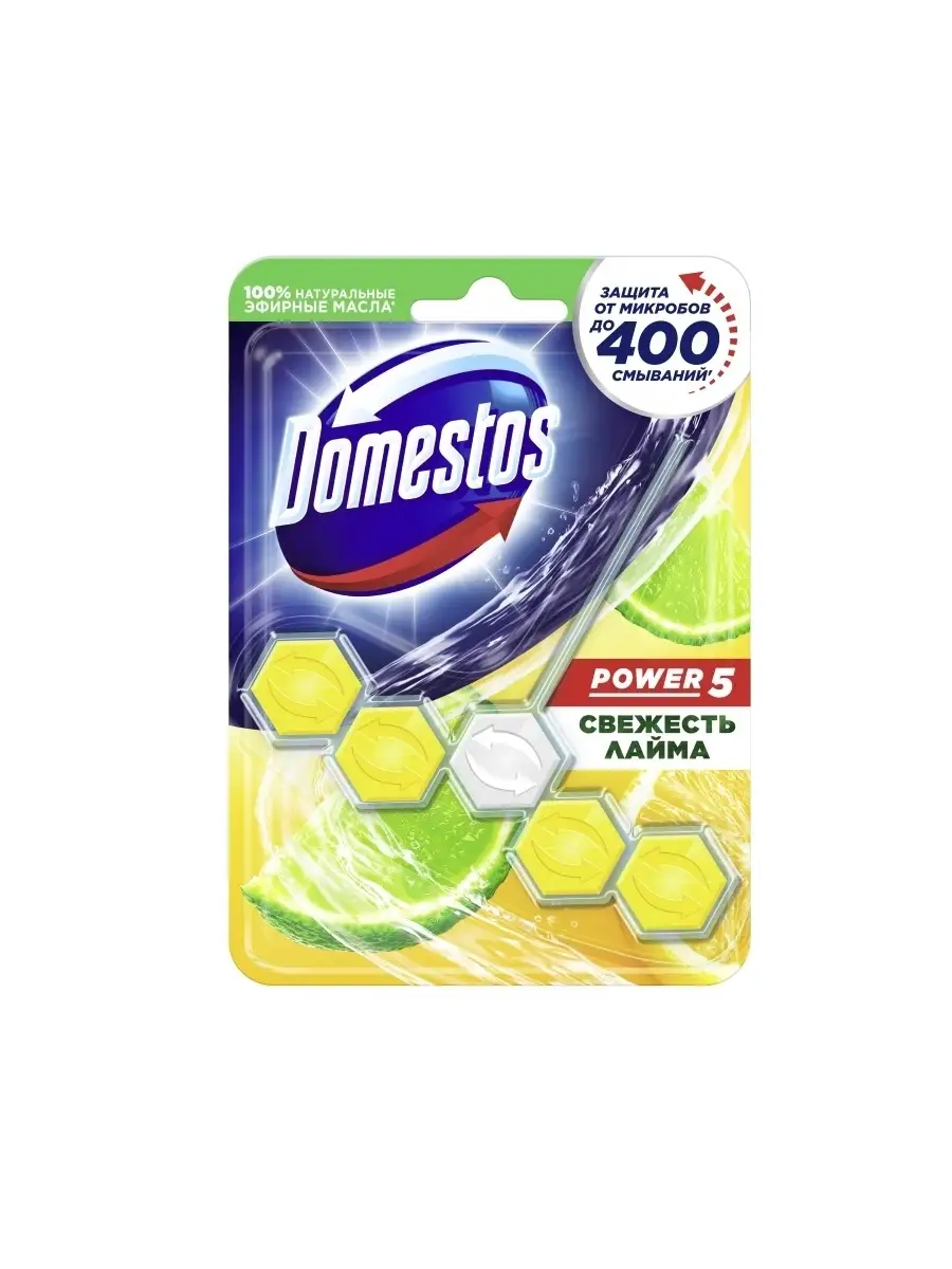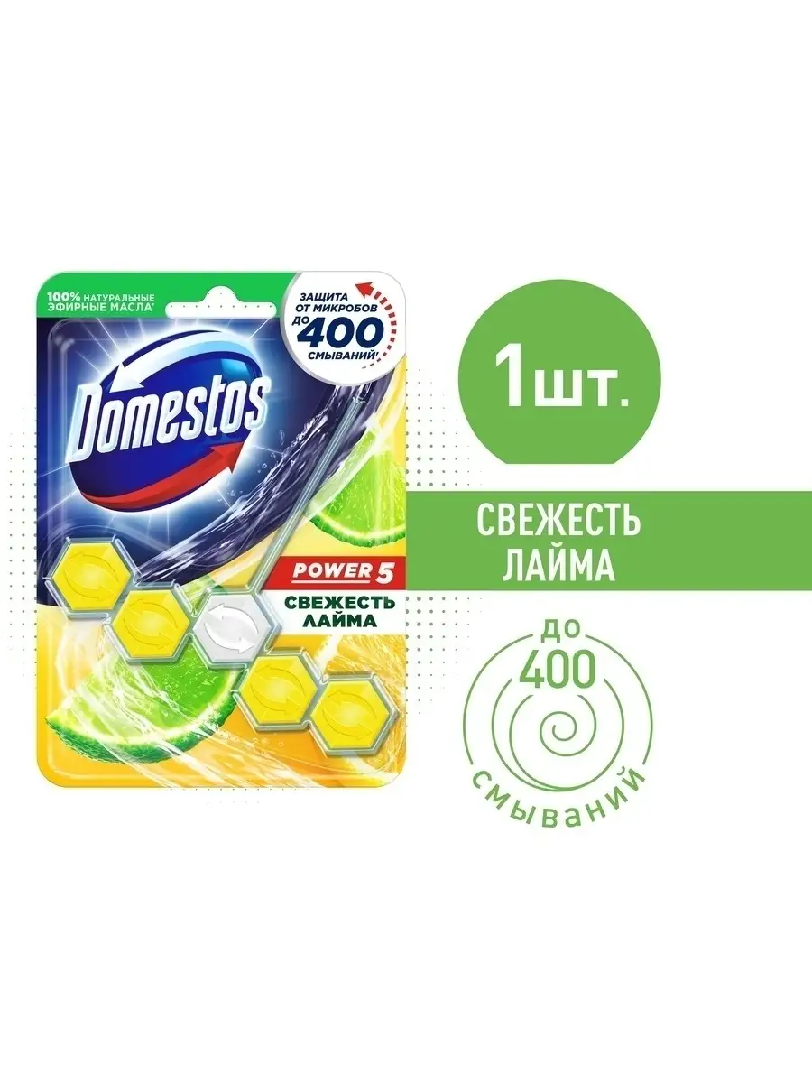 Описание: Попробуйте купить сменный блок для очищения туалета Domestos Power 5 Свежесть лайма против известкового налета и неприятного запаха, помогающий обеспечивать защиту от загрязнений и микробов. При каждом смывании появляется свежий аромат лайма на срок до 4 часов и обильная пена, которая борется с налетом, поддерживая гигиену и блеск поверхности унитаза. Блок для унитаза Domestos содержит активное вещество, которое под действием напора воды защищает от бактерий и помогает бороться с появлением известкового налета. Средство наполняет комнату ярким ароматом, который предотвращает неприятные запахи и остается в течение длительного времени после смывания - до 4 часов.Как установить туалетный блок Domestos? Вскройте пластиковую упаковку, достаньте блок и поместите под ободок унитаза в место наиболее сильного потока воды с помощью держателя. После использования блока Доместос для унитаза Power 5 Свежесть лайма выбросите его в мусорное ведро.