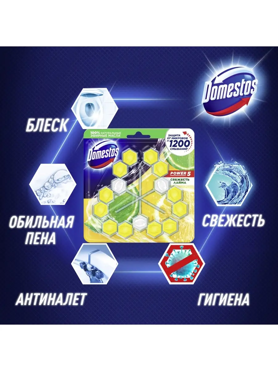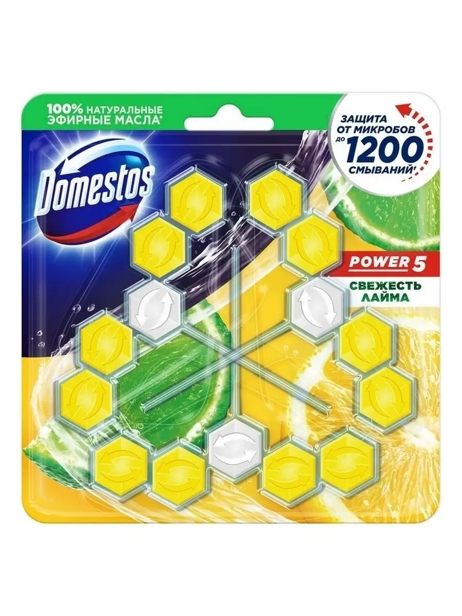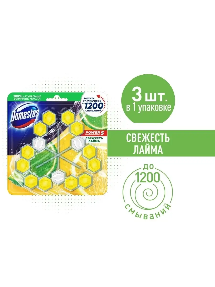 Описание: Попробуйте сменный блок для очищения туалета Domestos Power 5 Trio Свежесть лайма против известкового налета и неприятного запаха, помогающий обеспечить защиту от загрязнений и микробов. При каждом смывании появляется свежий аромат лайма на срок до 4 часов и обильная пена, которая борется с налетом, помогая поддерживать гигиену и блеск поверхности унитаза. Блок для унитаза Domestos содержит активное вещество, которое под действием напора воды защищает от бактерий и борется с появлением известкового налета. Средство наполняет комнату ярким ароматом, который помогает предотвращать неприятные запахи и остается в течение длительного времени после смывания - до 4 часов.Как закрепить туалетный блок? Вскройте пластиковую упаковку, достаньте шарики для унитаза и поместите блок под ободок туалета в место наиболее сильного потока воды с помощью держателя. После использования блока для туалета Доместос Power 5 Trio Свежесть лайма выбросите его в мусорное ведро и установите запасной блок из упаковки.
