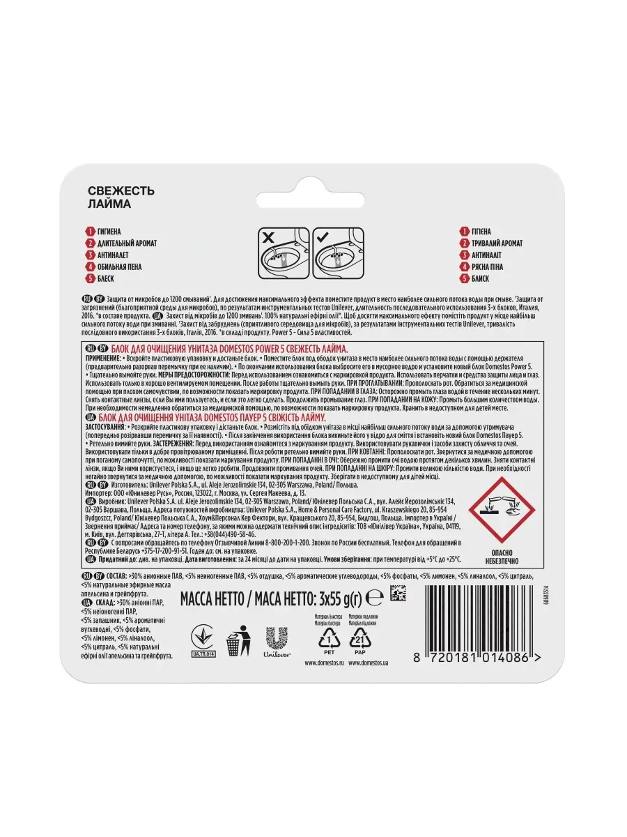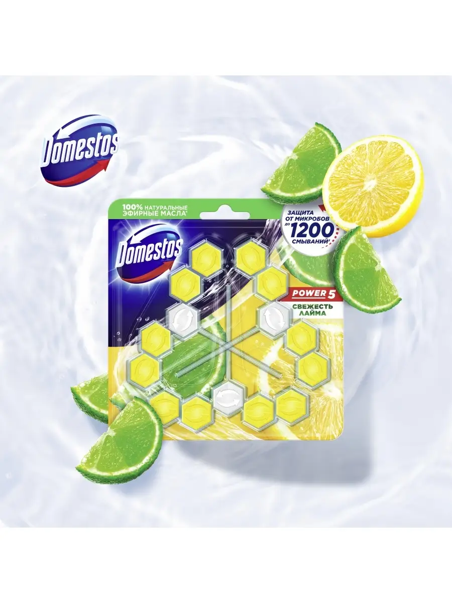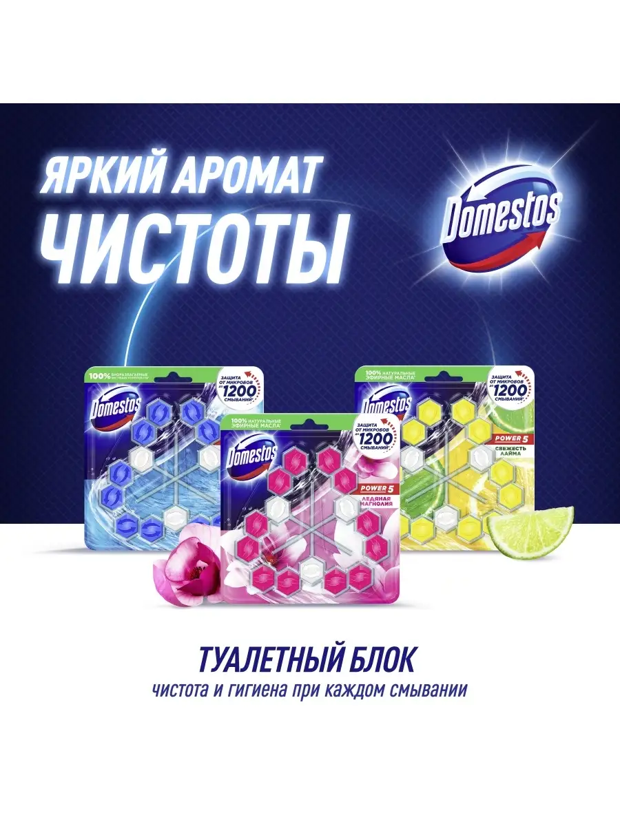 Описание: Попробуйте сменный блок для очищения туалета Domestos Power 5 Trio Свежесть лайма против известкового налета и неприятного запаха, помогающий обеспечить защиту от загрязнений и микробов. При каждом смывании появляется свежий аромат лайма на срок до 4 часов и обильная пена, которая борется с налетом, помогая поддерживать гигиену и блеск поверхности унитаза. Блок для унитаза Domestos содержит активное вещество, которое под действием напора воды защищает от бактерий и борется с появлением известкового налета. Средство наполняет комнату ярким ароматом, который помогает предотвращать неприятные запахи и остается в течение длительного времени после смывания - до 4 часов.Как закрепить туалетный блок? Вскройте пластиковую упаковку, достаньте шарики для унитаза и поместите блок под ободок туалета в место наиболее сильного потока воды с помощью держателя. После использования блока для туалета Доместос Power 5 Trio Свежесть лайма выбросите его в мусорное ведро и установите запасной блок из упаковки.