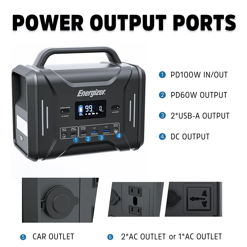 Выход (более быстрая зарядка PD100 Вт), 1 * Type-COutput (PD60W) и 2 * выхода постоянного тока, 1 * светодиодный фонарик