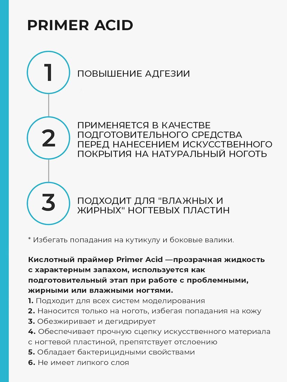 Описание: Прозрачная жидкость с характерным кислотным запахом. Применяется в качестве подготовительного средства перед нанесением гелевого или акрилового покрытия на натуральный ноготь, помогает предотвратить отслойки материала. Кислотный праймер Космопрофи сохнет на воздухе в течение 1 минуты. Средство наносится одним тонким слоем. После просыхания на поверхности не остается липкости. Расход средства очень низкий. Совместим с любыми типами покрытий: акрил, гель, гель-лак.