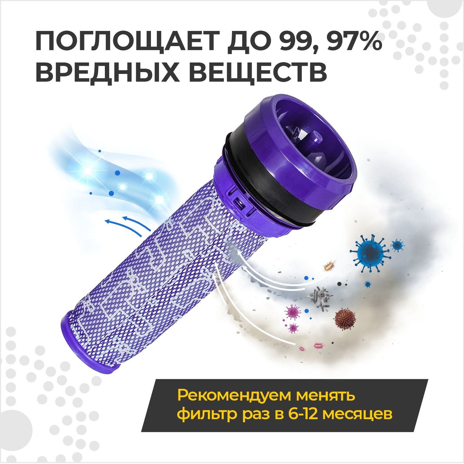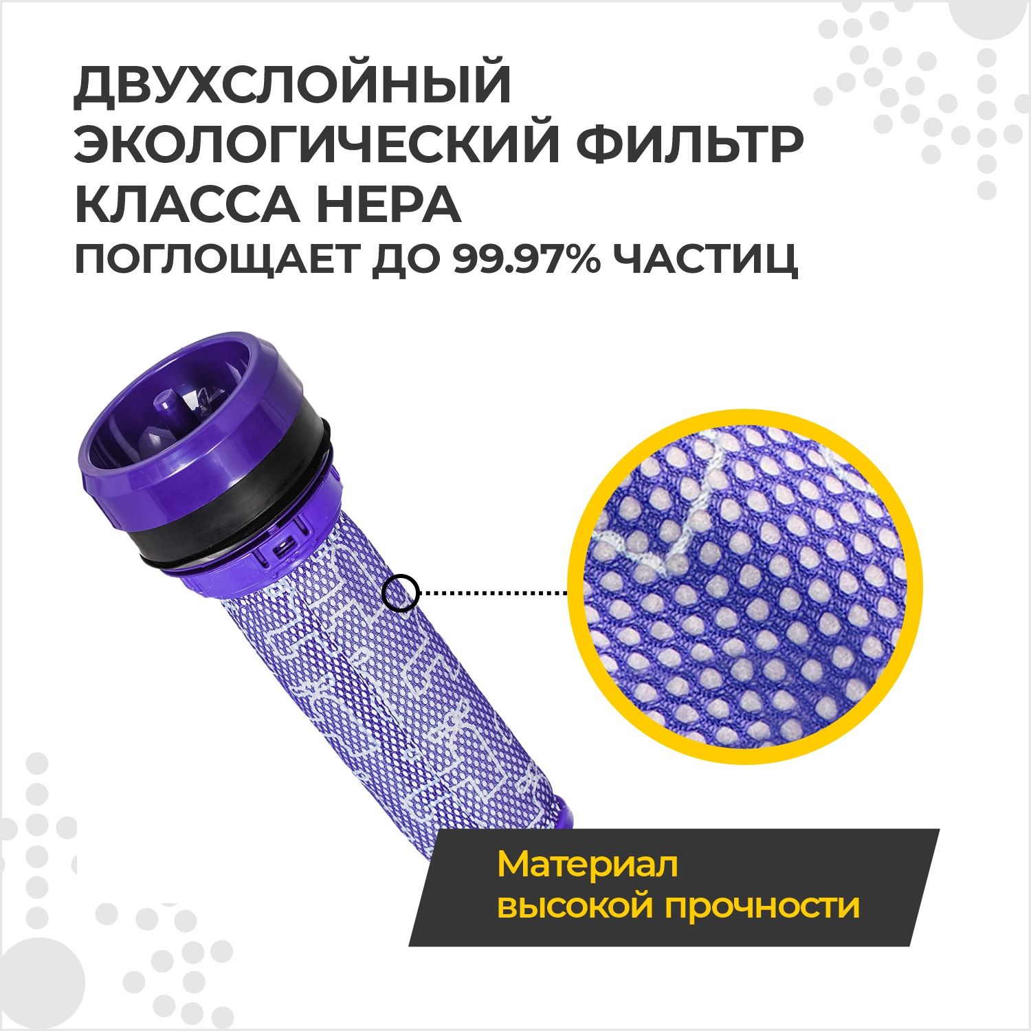 Корпус фильтра для пылесоса дайсон выполнен из качественного ABS пластика. Фильтр для вертикального пылесоса dyson отличается высокой степенью фильтрации, двухслойный экологический фильтр для пылесоса класса Hepa фильтрует до 99,97% вредных веществ, обеспечивает качественную уборку во всем доме и эффективную очистку воздуха. Поглощает пыль, волосы, шерсть домашних животных, мусор, пыльцу и множество различных аллергенов.