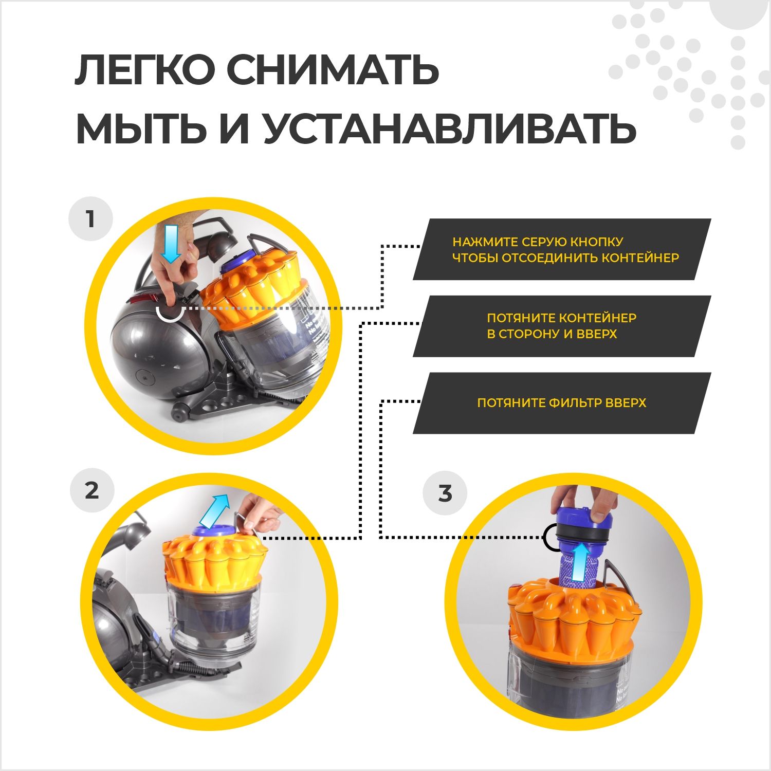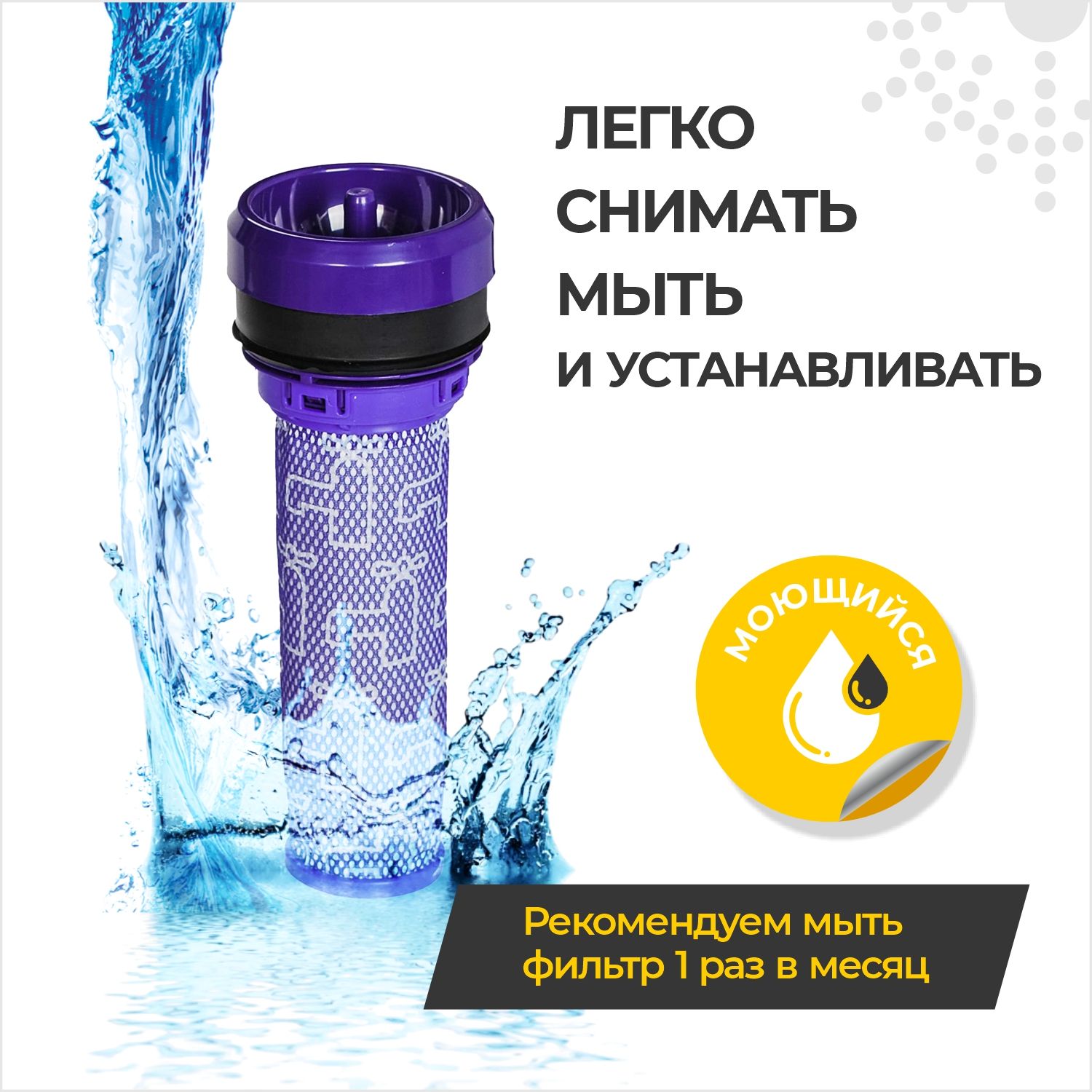 Фильтр для дайсон DC37, DC30, DC33, DC39 легко извлекается и быстро устанавливается. Можно промывать под водой. Рекомендуется промывать фильтр для пылесоса в прохладной воде без использования моющих средств раз в месяц. Высушить перед уборкой.