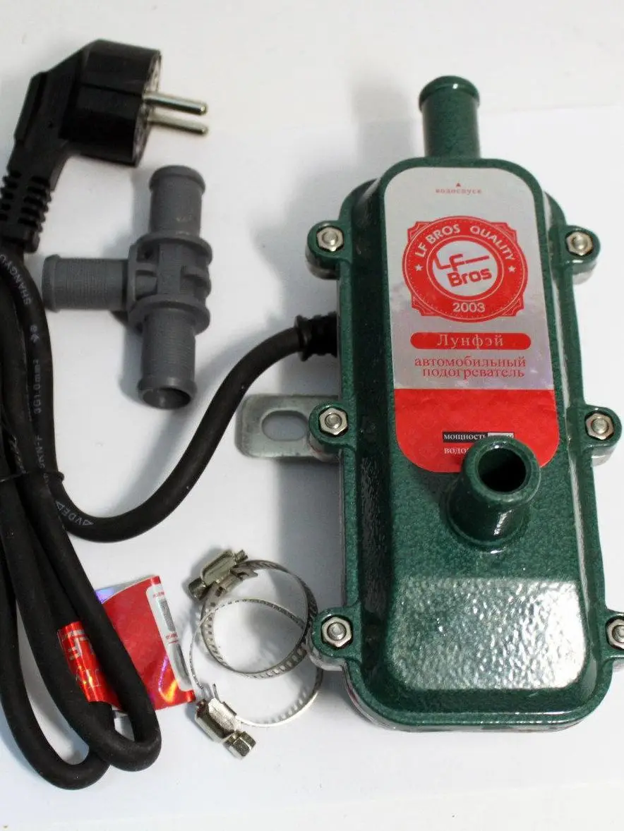 В комплект подогревателя входит подробная инструкция на русском языке со схемами монтажа и правилами эксплуатации, и монтажный комплект - два хомута и тройник. Установить подогреватель Лунфей возможно как в автосервисе так и самому.