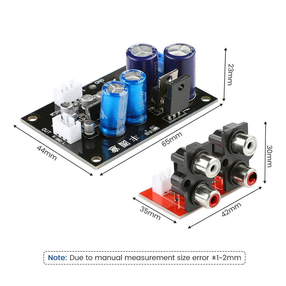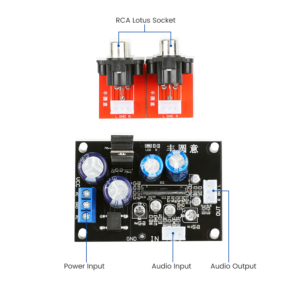 Use the special amplifier chip of vinyl record player, the effect is better than the amplifier board of NE5532 and other operational amplifiers. The circuit is designed with frequency compensation circuit, the sound frequency band is more balanced, the input signal filter circuit has relatively lower noise, and the rectifier filter voltage stabilizer circuit.
