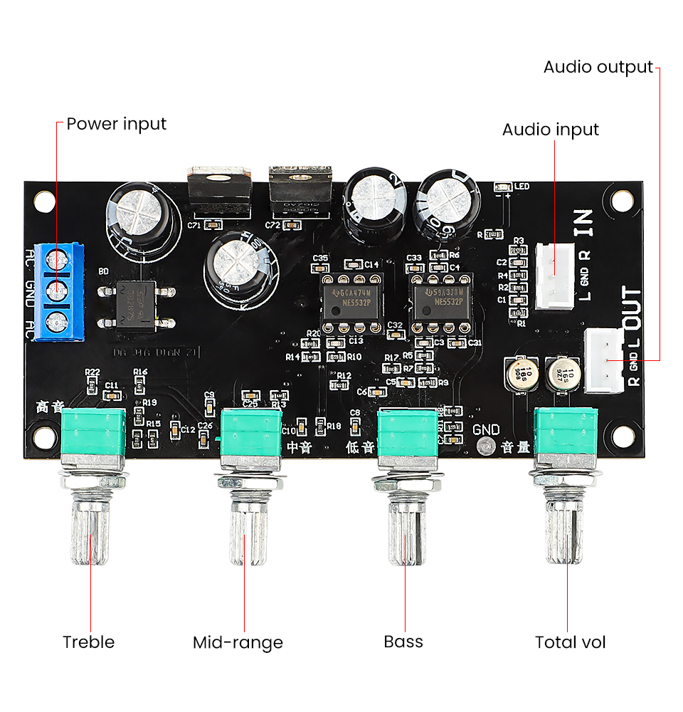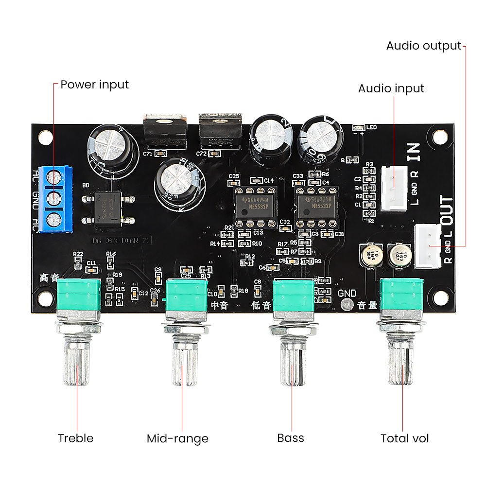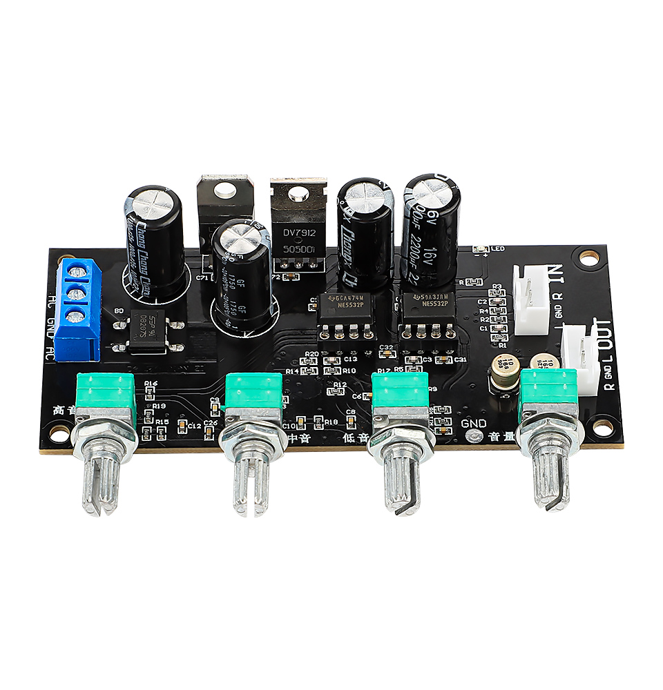 Питание от двух источников питания, tone board принимает энтузиастов класса op amp NE5532, сделанные по технологии патч, малый размер дизайн, AC и DC двойного использования.