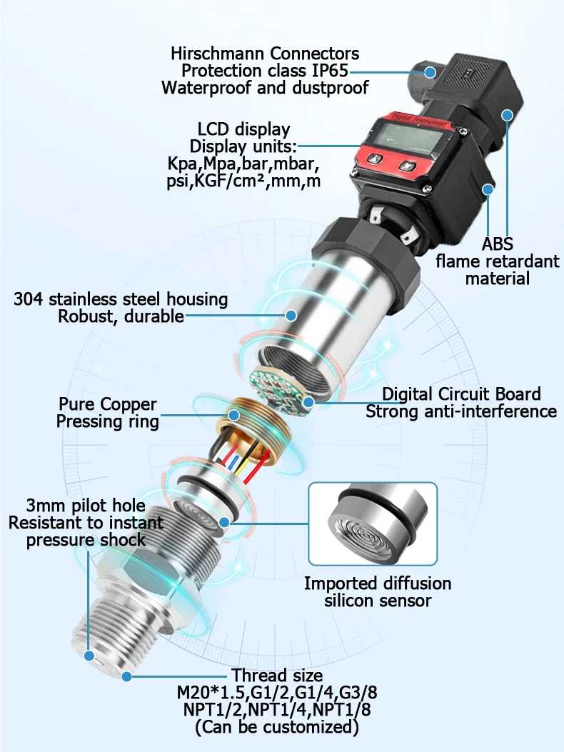<2>.Датчик давления изготовлен из нержавеющей стали, элементы измерения давления выбираются от хороших поставщиков. Специальные схемы используются для удобного регулировки нулевого и полного диапазона.