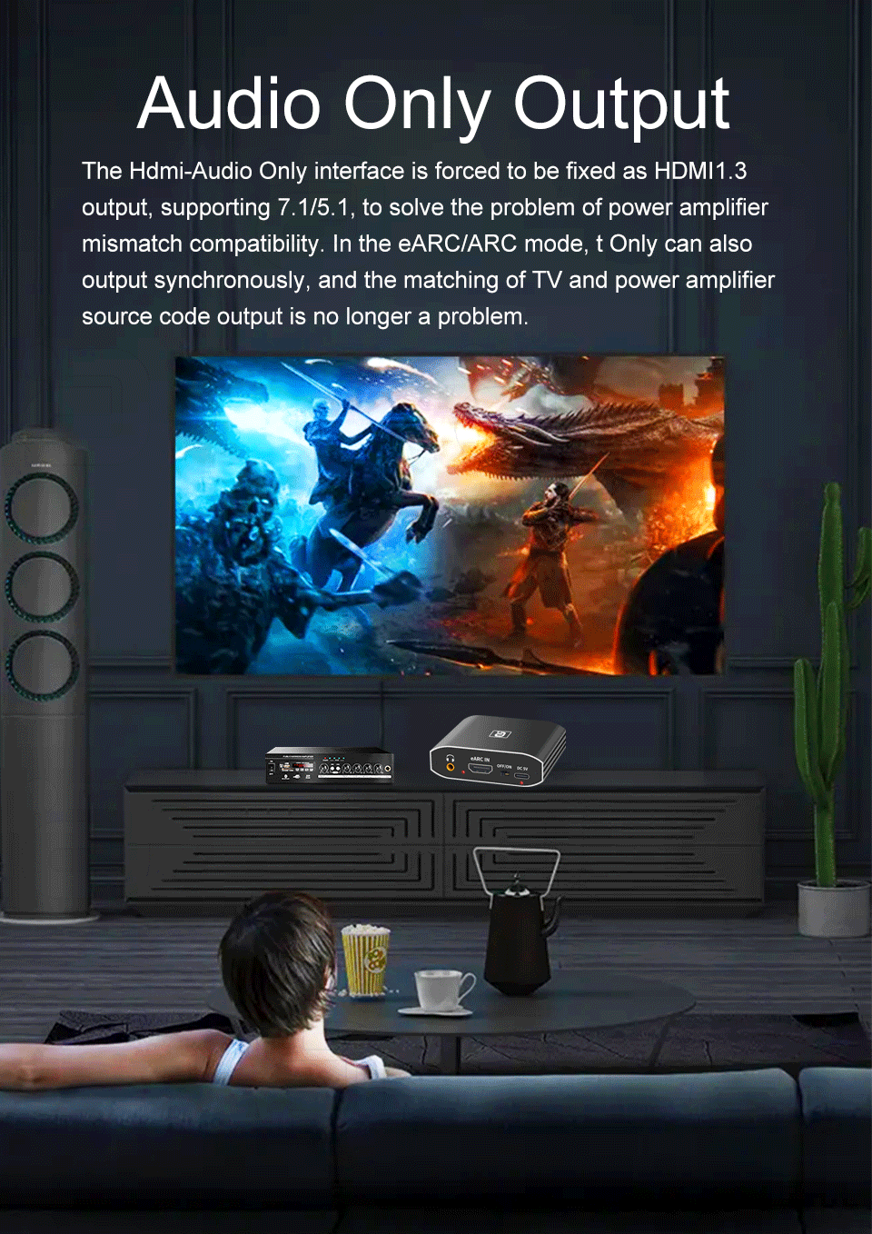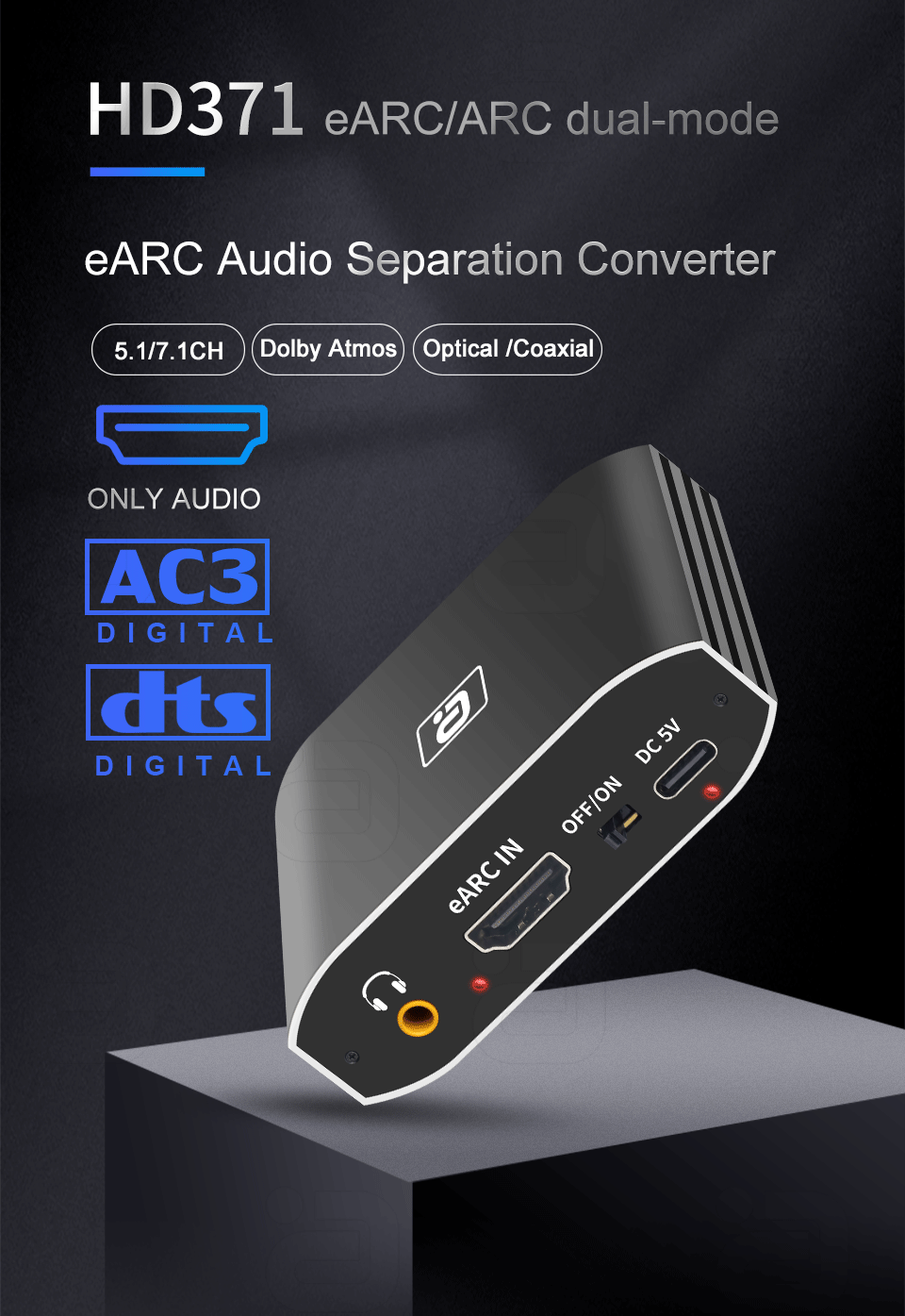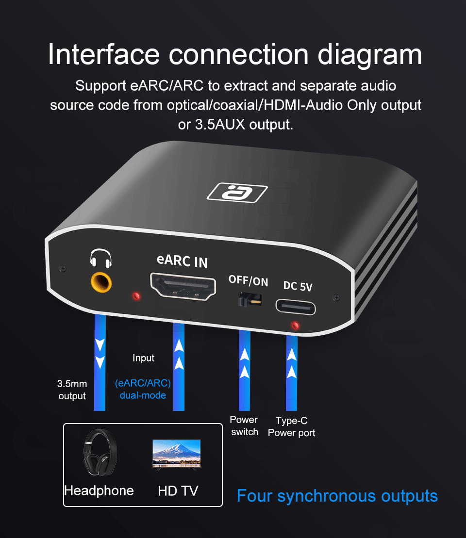 Этот HDMI-совместимый аудио-адаптер обратного канала может передавать аудио от телевизора с поддержкой функции eARC к оптическому, коаксиальному, 3,5 мм аудио и мультимедийный интерфейс высокой четкости-совместим только адаптер через HDMI-Совместимость ARC / eARC интерфейс, и выход одновременно что идеально решает проблемы отсутствия интерфейса аудиовыхода, который телевизор не может быть подключен к звуковой системе. Поддержка разъединения аудио PCM, 7.1CH импульсно-кодовая модуляция (Lpcm), DTS, AC-3, Dolby панорама и другого звукового контента в входы: HDMI HD сигнала и выходов от волоконно-оптический кабель, волоконно-оптический 3,5 мм и 'HDMI-Совместимость аудио только выходными портами.