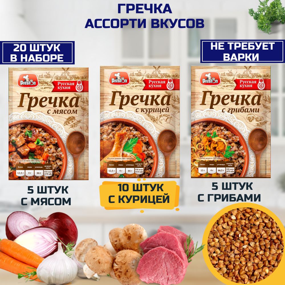 PRESTON / Гречка быстрого приготовления, не требующая варки АССОРТИ / Набор 20 штук по 40 г