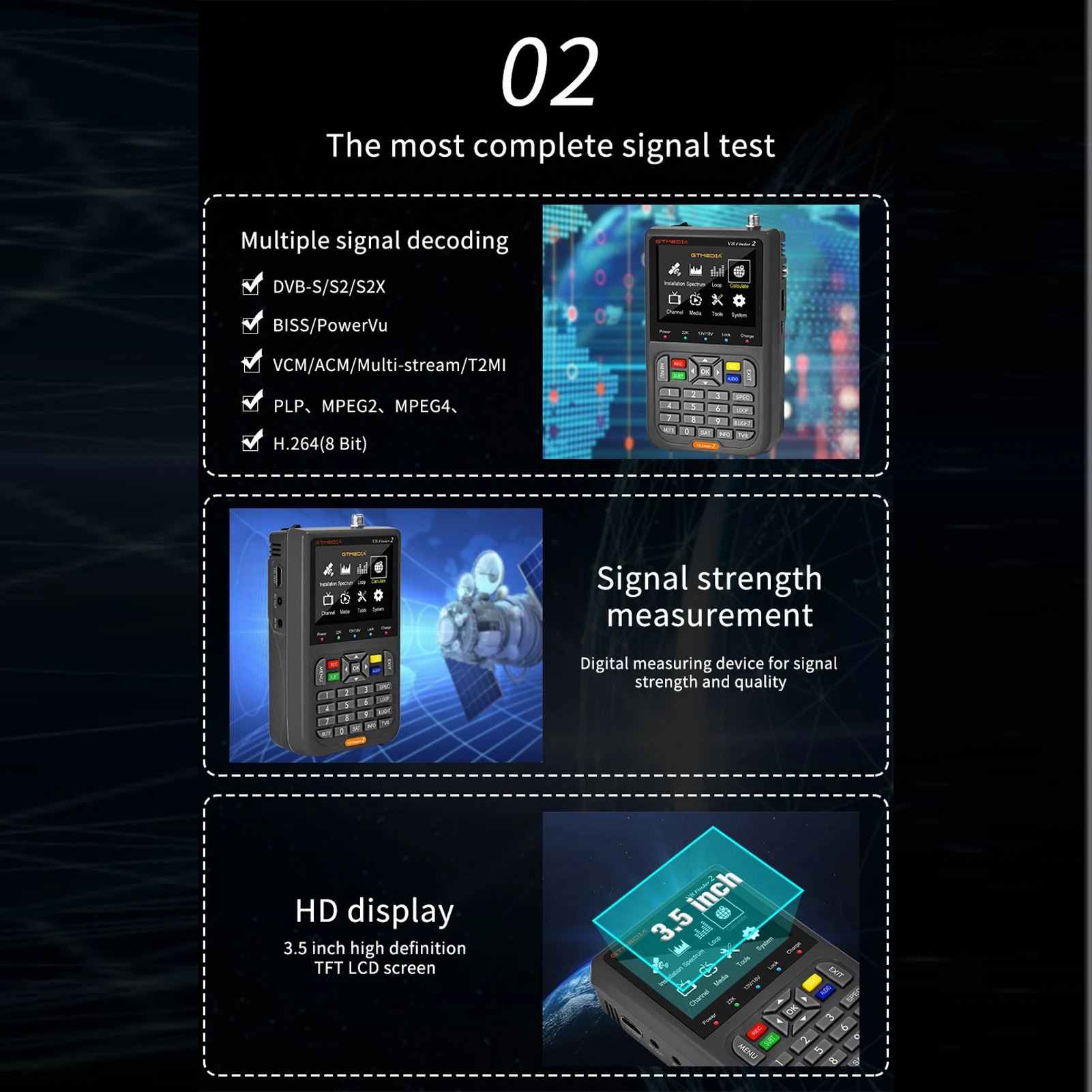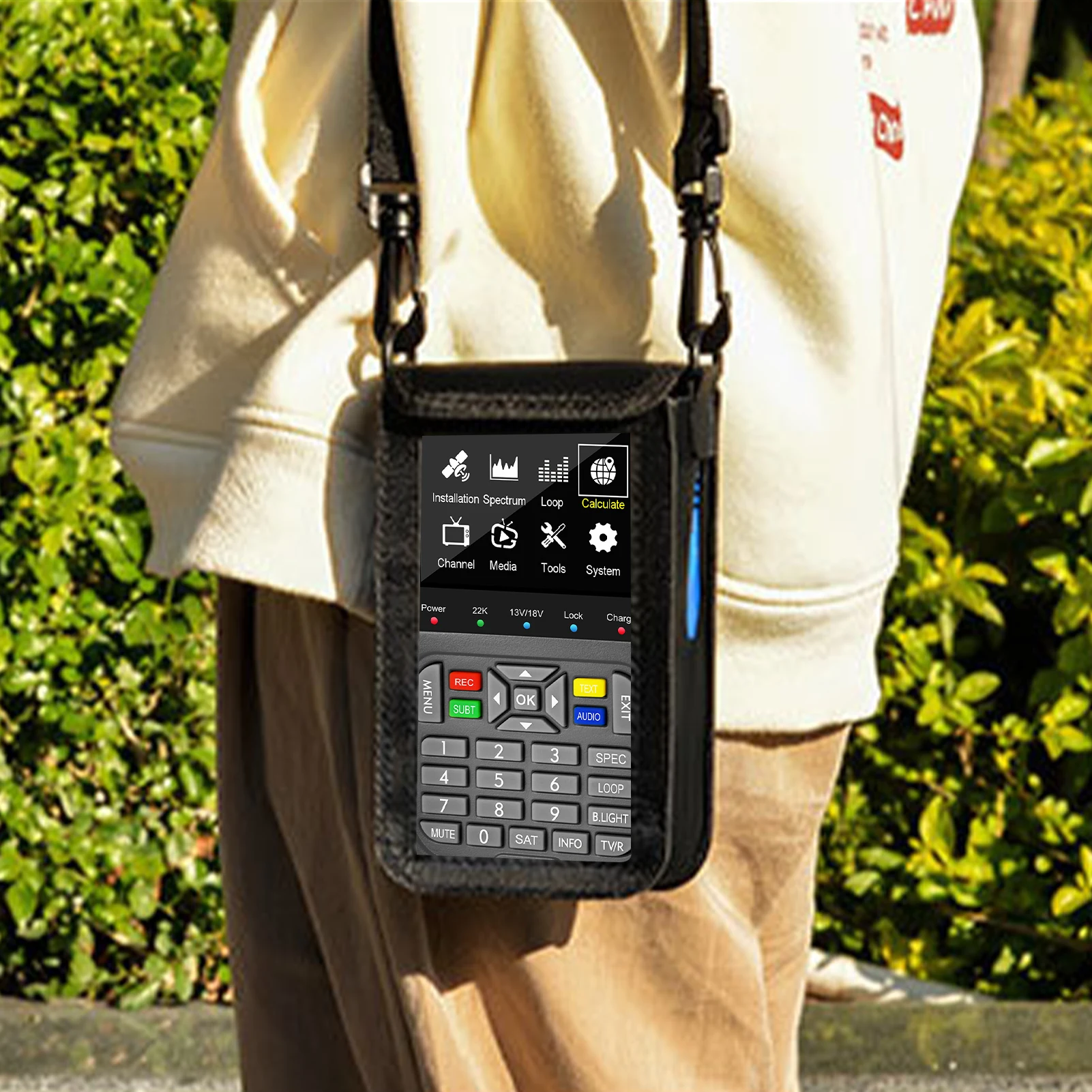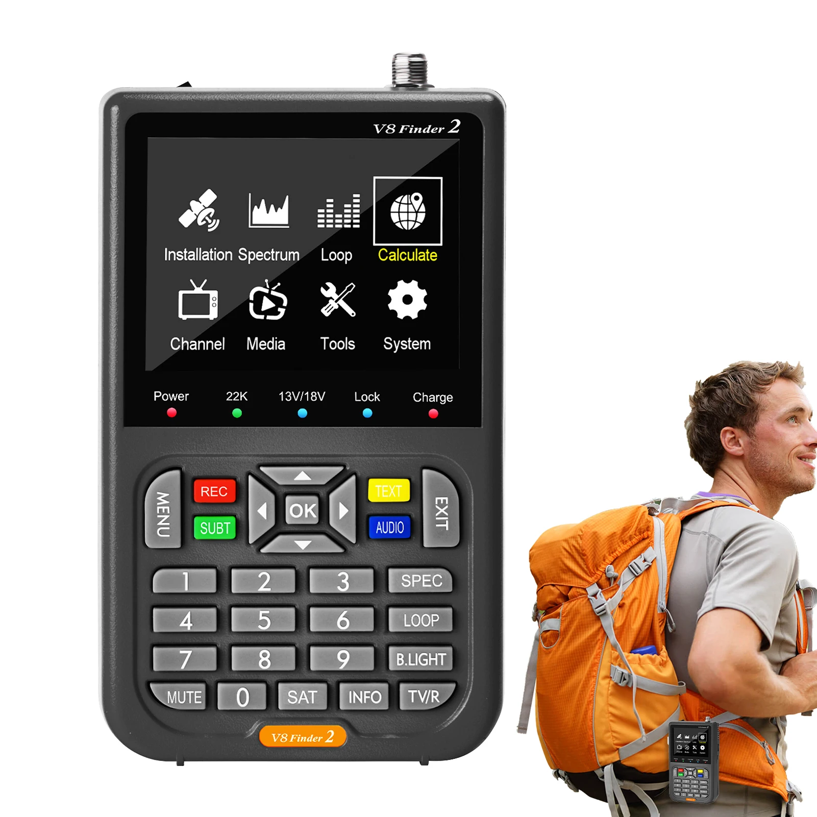 Satellite Finder Meter is not only a satellte finder, but also a combination of DVB-S2X//S satellite de-code and HD. It allows you to de-code the satellite channel and watch satellite channels directly on its’ 3.5 Inch HD LCD screen.