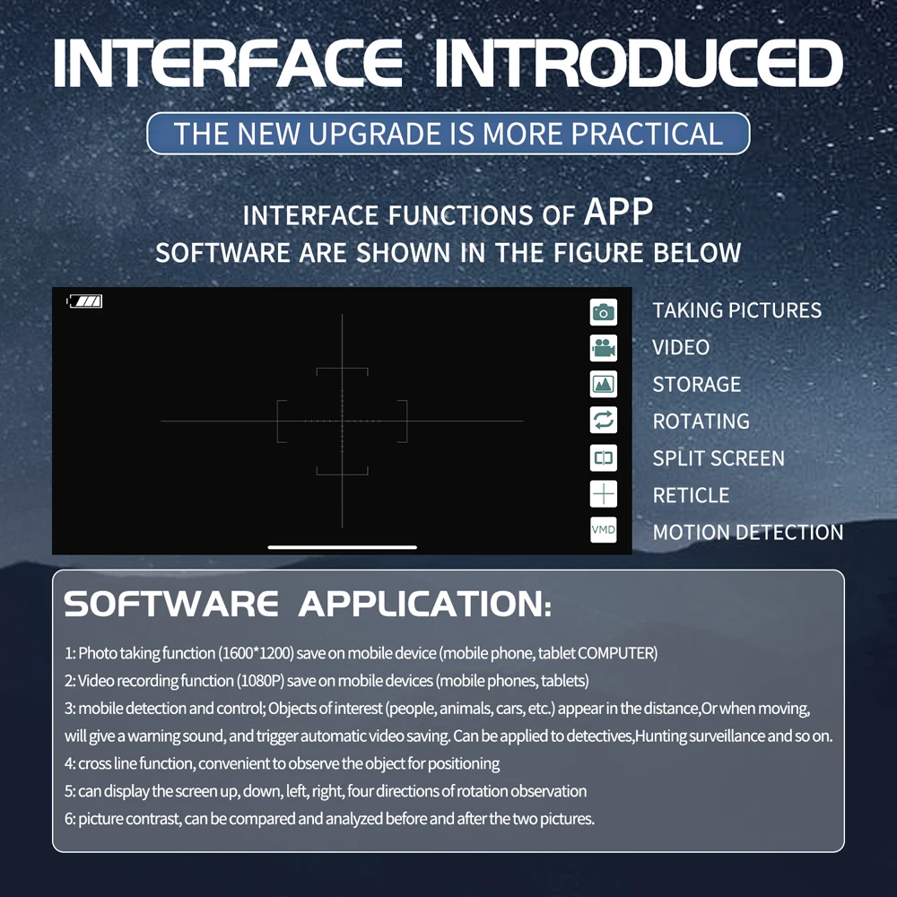 【Профессиональное ночное видение 】: Это устройство ночного видения имеет оптический объектив диаметром 6 мм, четкое определение 1080P. Эти профессиональные конструкции делают это устройство ночного видения подходящим для ежедневного использования.
