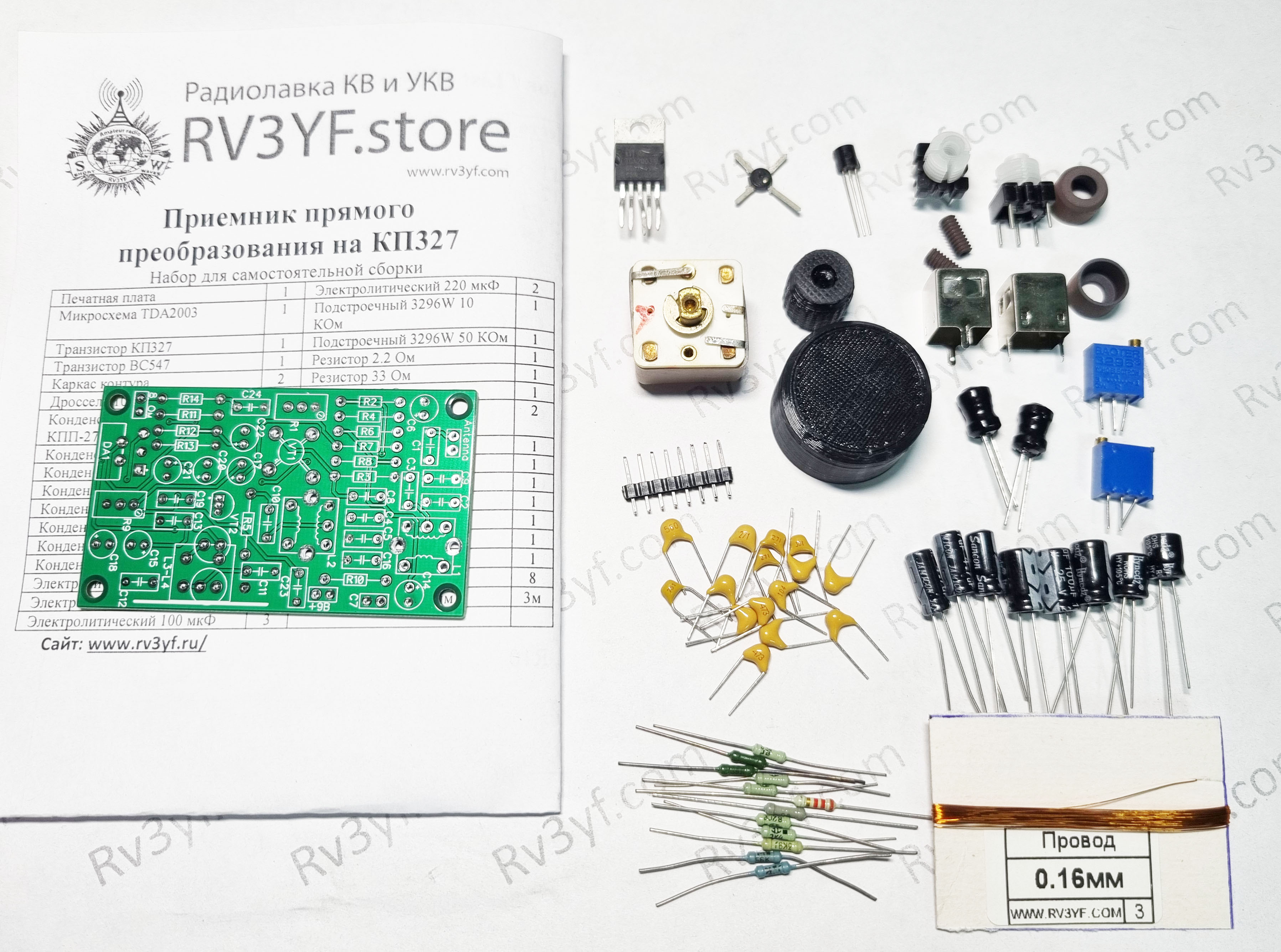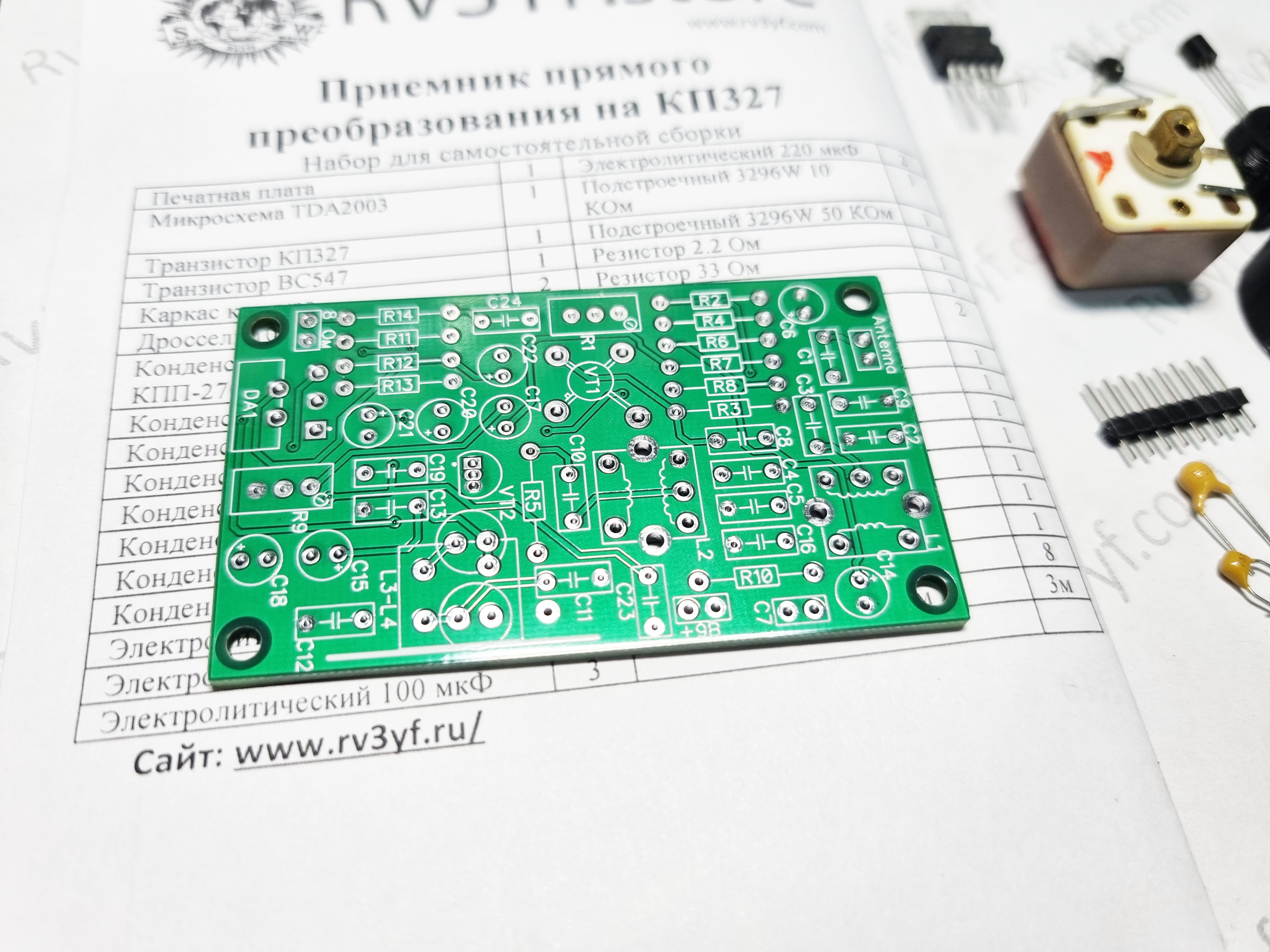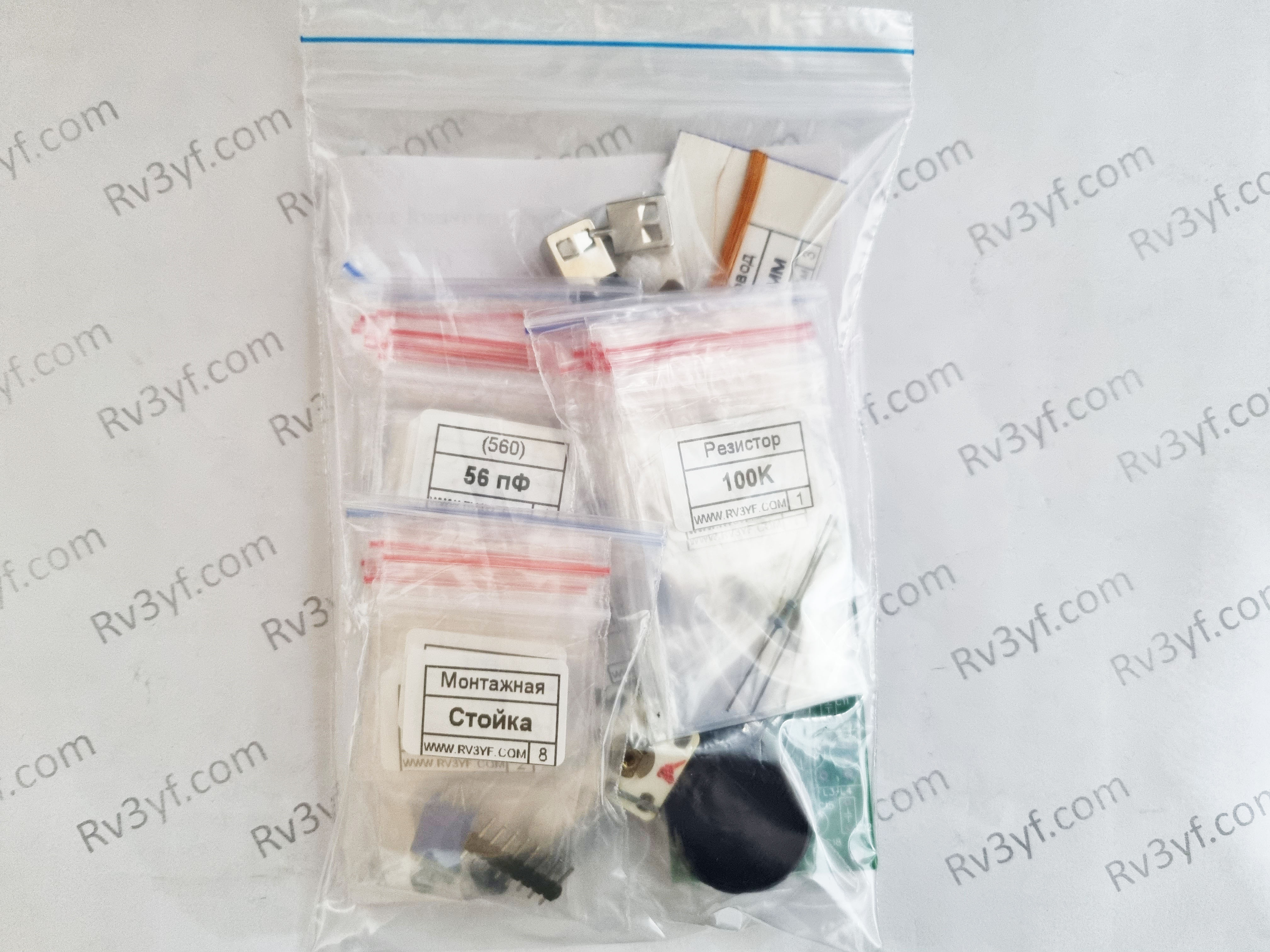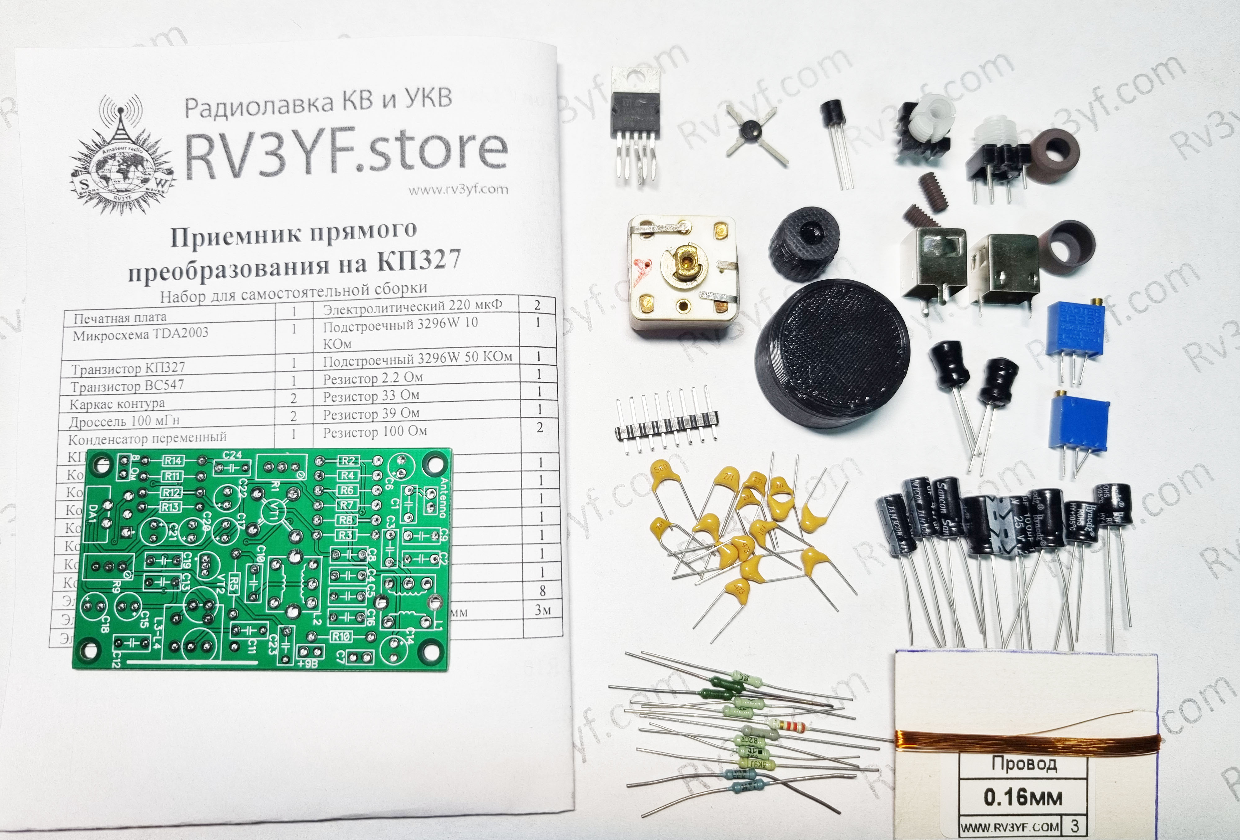 Состав набора: Печатная плата, микросхем, транзисторы, каркасы контуров и провод к ним, конденсаторы керамические и электролитические, постоянные и подстроечные резисторы, переменный конденсатор типа КПП2,